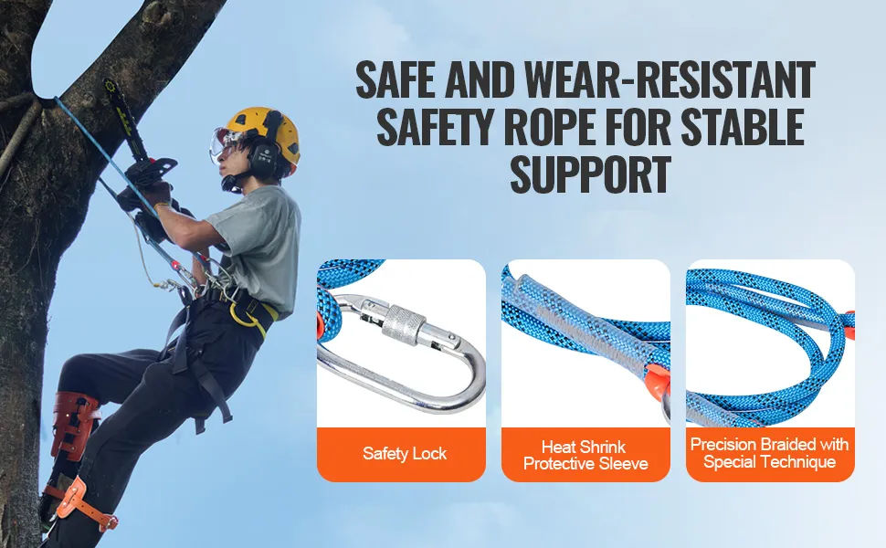 Medžio laipiojimo smaigalys rinkinys ateina su saugos virvę, kad yra didelis tvirtumas ir atsparumas dėvėjimuisi, sumažina kritimo. Idealus medžių genėjimas, vaisių skynimas, ir pole darbo, saugos virvės teikia tvirtą paramą, todėl laipiojimo saugiau.