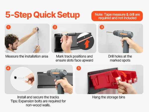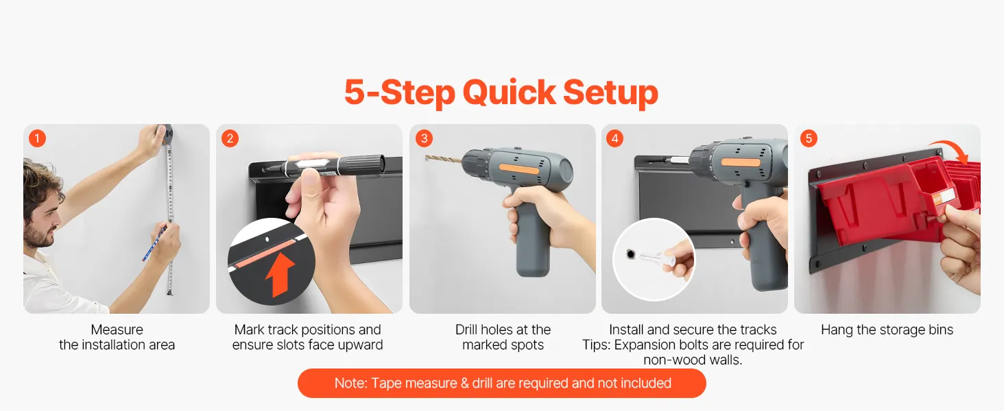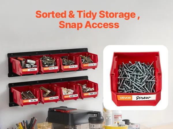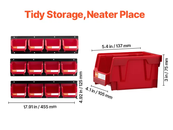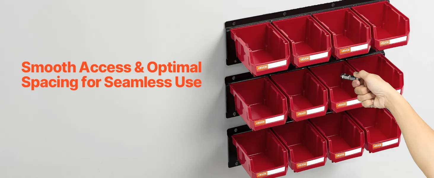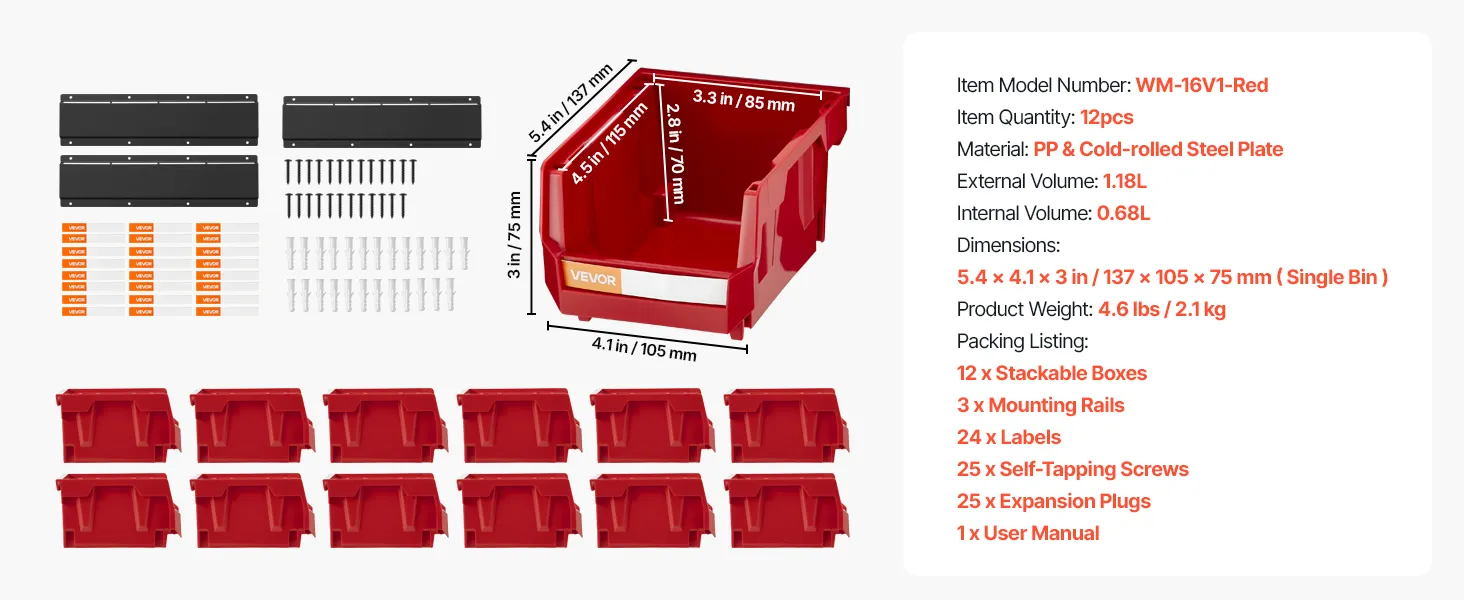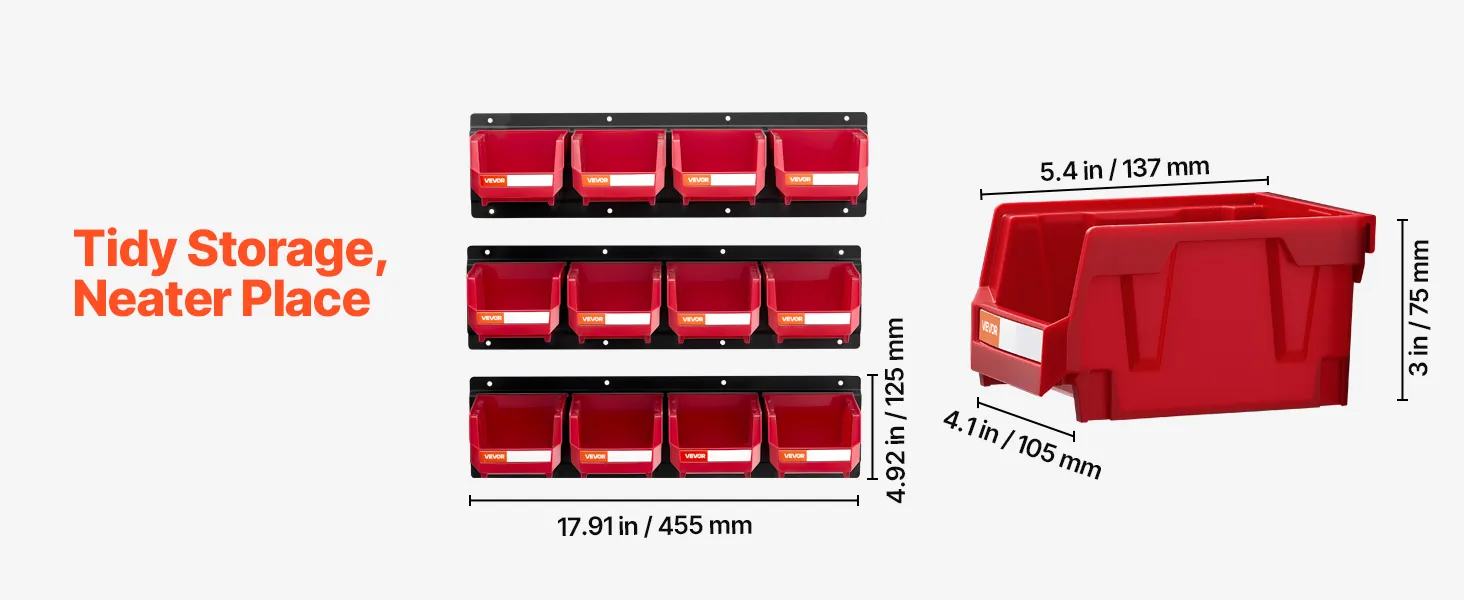 VEVOR Wall Mounted Storage Bins Set – 12 Stackable Plastic Bins with 3 Metal Rails, Red Organizer for Workshop & Garage