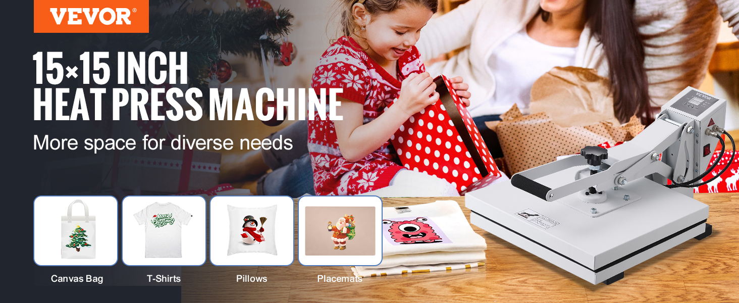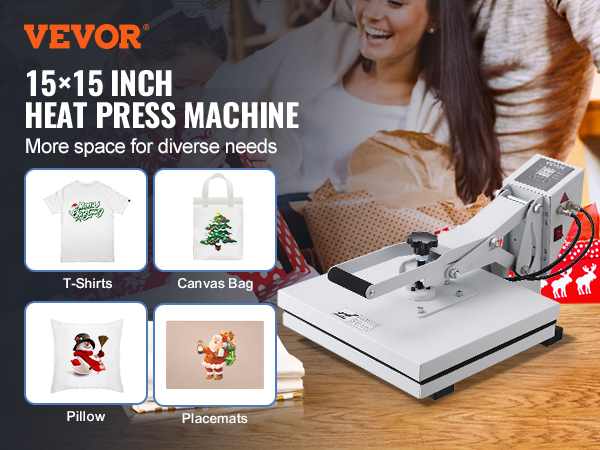 • Vienkārši lietojams: VEVOR 15 collu x 15 collu sublimācijas iekārta ir noderīga dāvanu izgatavošanai visiem ģimenes locekļiem vai draugiem. To var izmantot T-krekliem, spilveniem, somām, tālruņu apvalkiem utt. Ātri pārnesiet krāsainus attēlus un rakstzīmes uz tekstilizstrādājumiem, piemēram, kokvilnas, auduma, HTV, keramikas, glāzēm, audumiem, liniem, neilonam utt.
