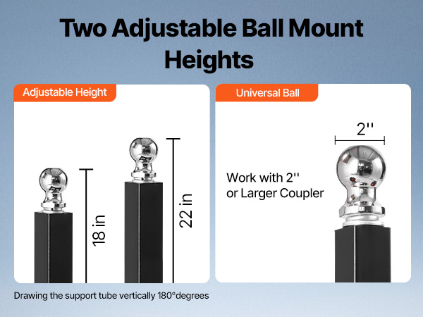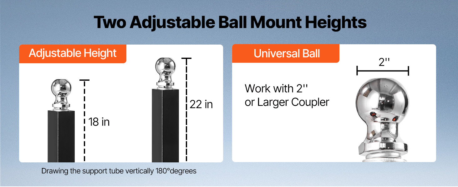 • Universāls izmērs: Jūs varat bez piepūles pielāgot 18 collu un 22 collu augstumu, lai pielāgotos dažādiem piekabju izmēriem. Ar 2 collu diametra universālo lodīti jūs varat vienkārši savienot ratiņus ar piekabes sakabes ierīci.