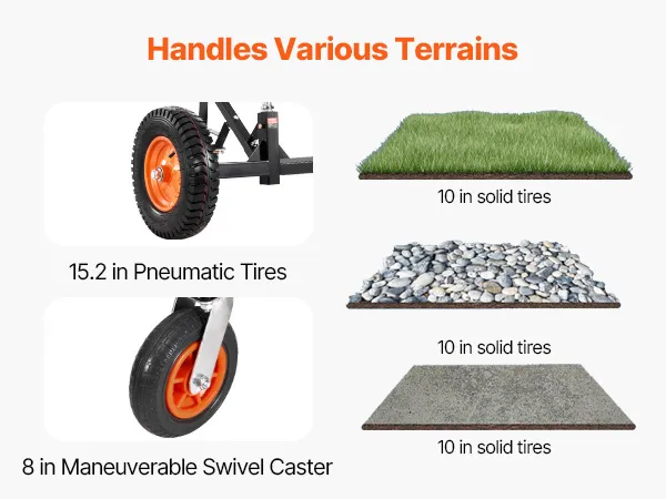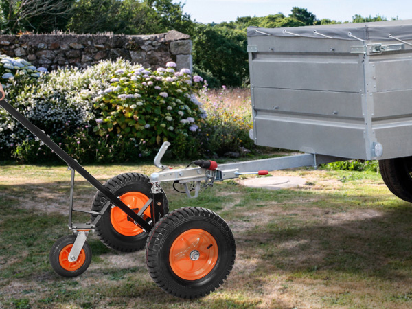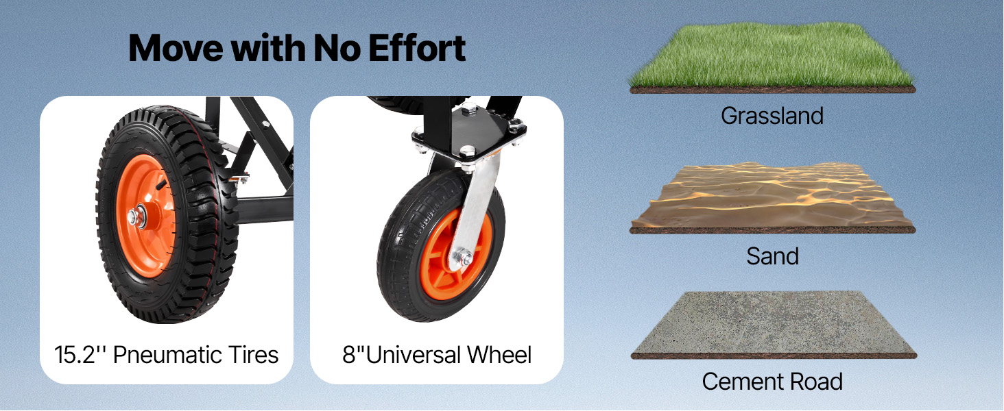 • Uzticama riepu konstrukcija: Šī piekabes ratiņi ir aprīkoti ar 15,2 collu liela izmēra pneimatiskajām riepām, kas spēj vienmērīgi ripot pa zālājiem, smiltīm, cementa ceļiem utt., neuztraucoties par riepas plīsumu. Turklāt ratiņus var ātri un ērti pagriezt, pateicoties aprīkotajam universālajam ritenim.