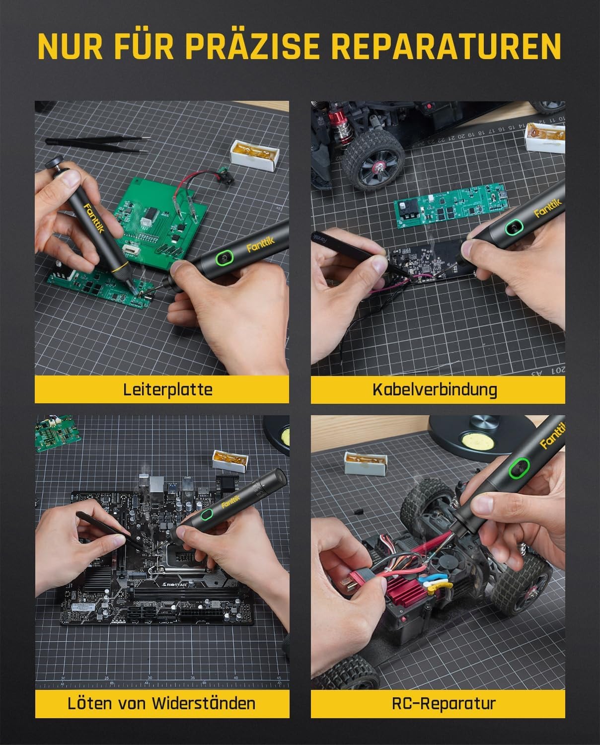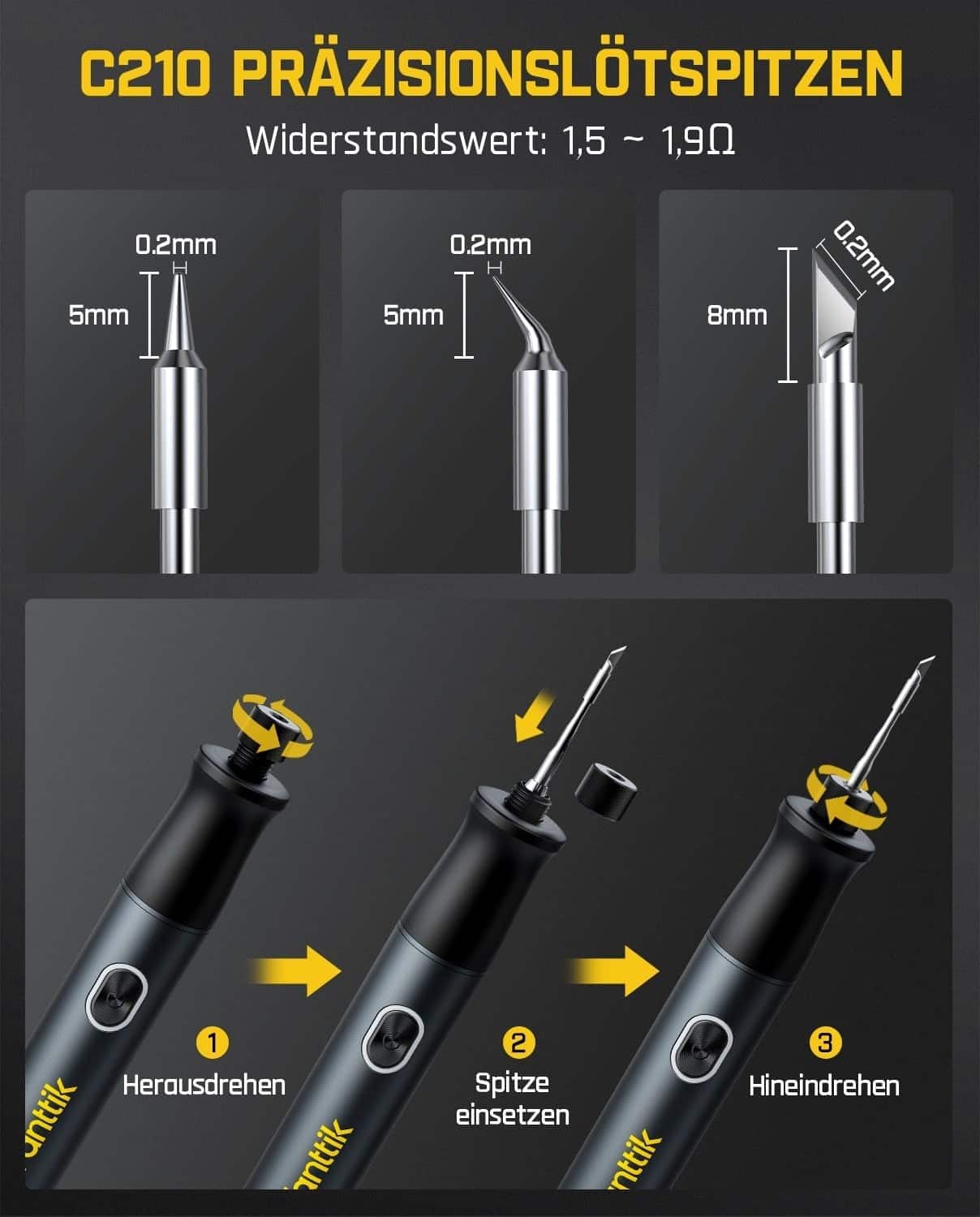 • Extreme Tin Plating: Fanttik T1 MAX is equipped with 4pcs C210 (C210-I, C210-IS, 2pcs C210-K) quick heating soldering tips, long life and anti-oxidation. You can achieve a fast heat/reheat time, with the fastest time being 7 seconds. Consequently, it shortens the waiting time and improves the efficiency of your repair tasks. In addition, with its soldering suction cup and precision tweezers, you can perform soldering work smoothly and safely.