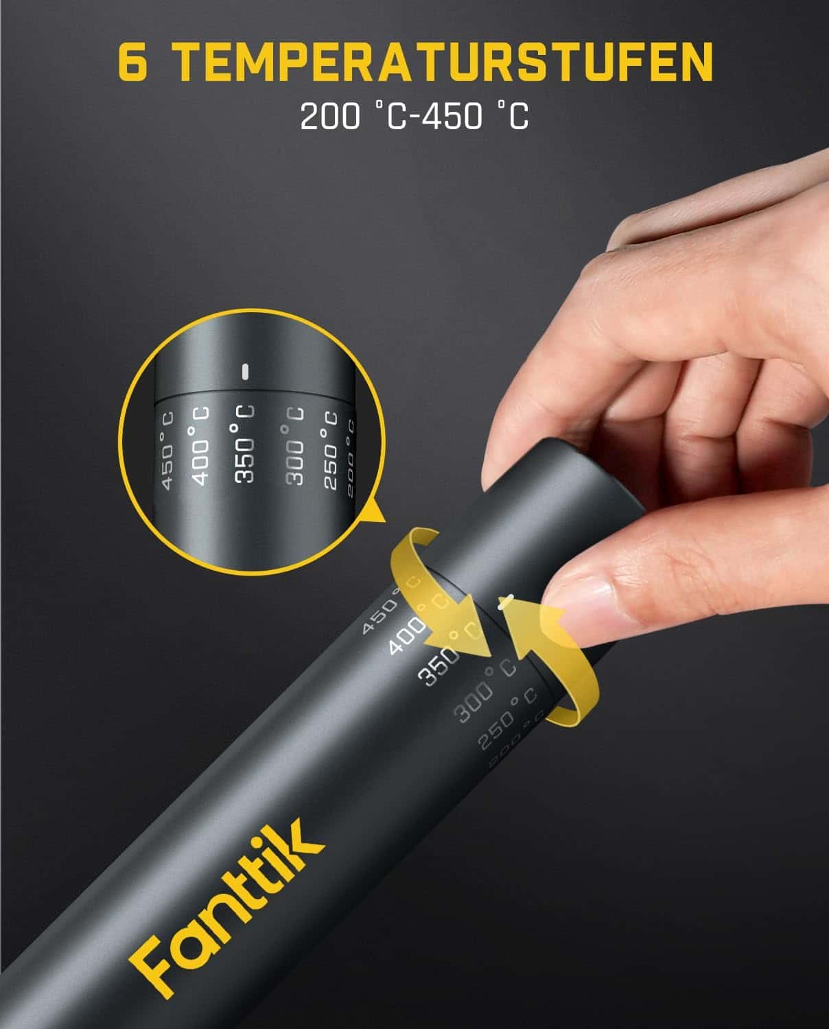 • 6 Temperature Levels The back button of the soldering iron has 6 levels to adjust the temperature. The temperature can be adjusted accurately and efficiently for different working situations in the range between 200°C and 450°C (390°F -840°F) so as not to damage heat-resistant components.