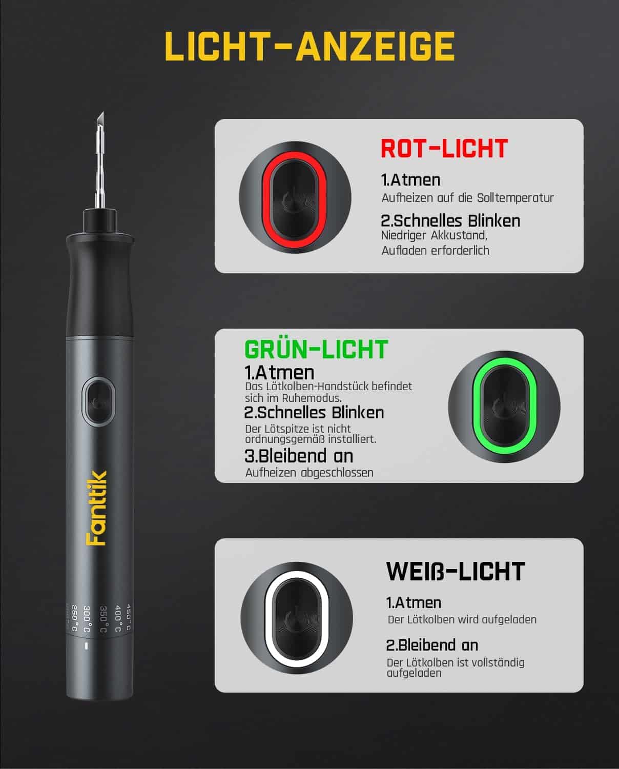 • Intelligent Gravity Detection After power on, the soldering iron will stand still for 15 seconds and then enter sleep mode. Fanttik T1 MAX will automatically restart to heat up to the temperature you set when you take it back in your hand. Note: when heating up, the red light flashes, while the green light always lights up when the heating is complete.