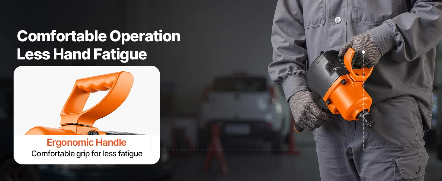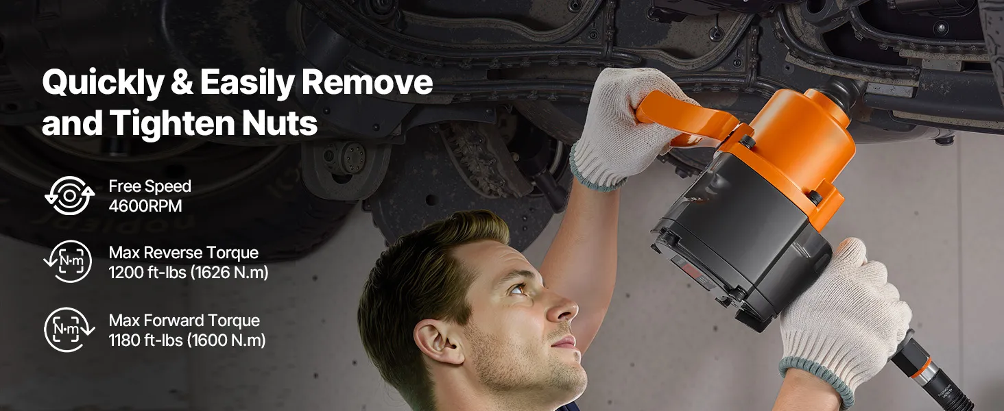 This 1" air impact wrench delivers up to 1200 ft-lbs (1626N.m) high reverse torque and 4600RPM free speed. It easily loosens bolts and nuts, making it ideal for heavy-duty automotive repair and maintenance on trucks, trailers, buses, machinery and industrial equipment.