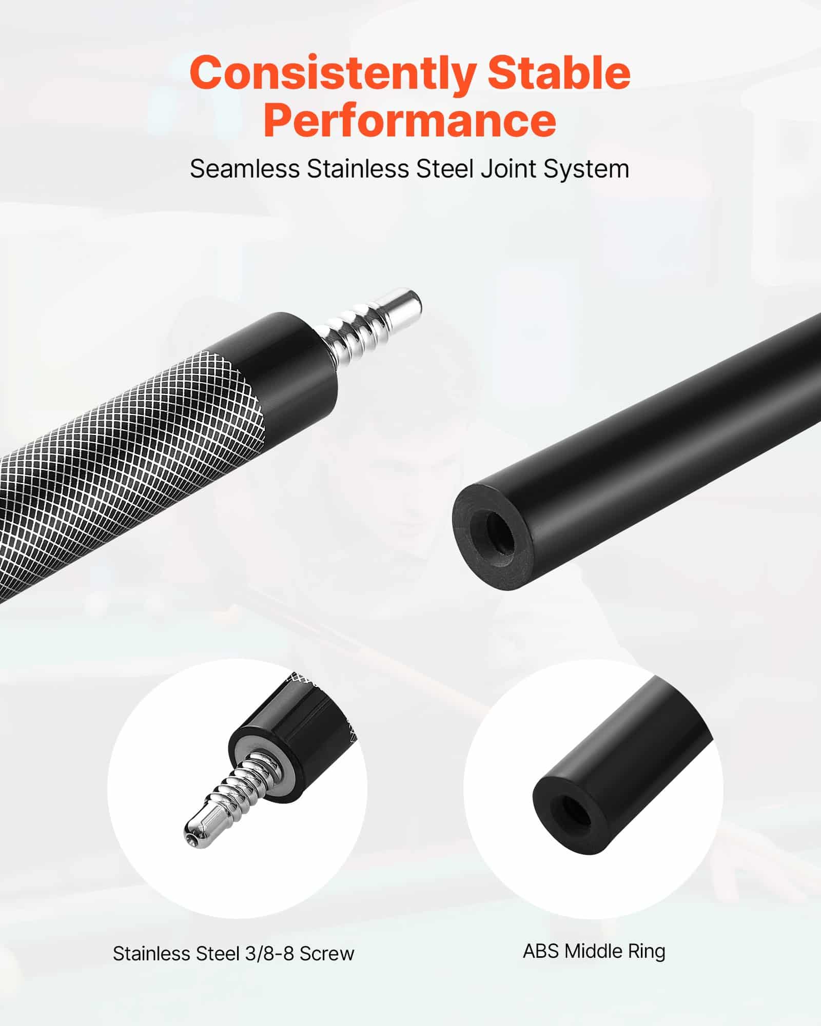 The 3/8-8 stainless steel joint provides a seamless connection, eliminating any wobbling for more stable shots. The matte finish offers a comfortable, non-slip grip, enhancing control and confidence with every shot in your pool cue stick set.