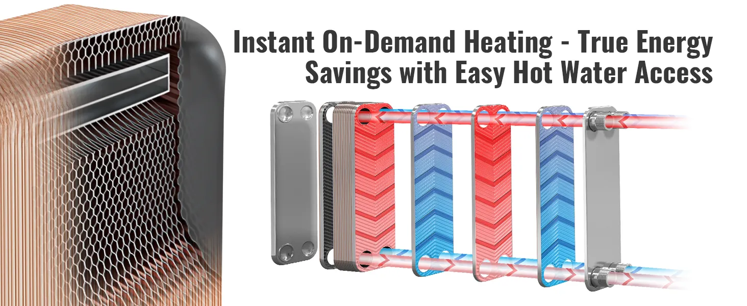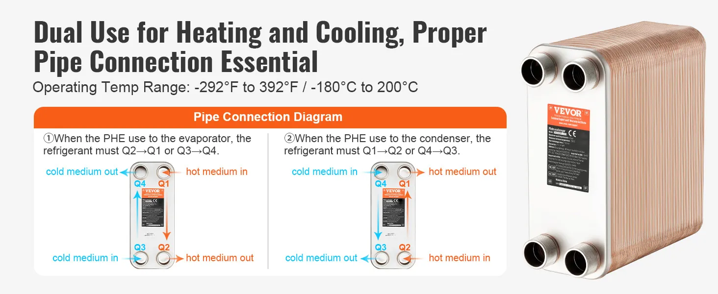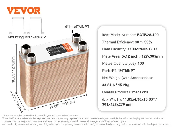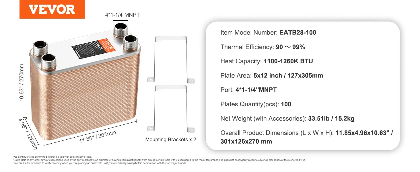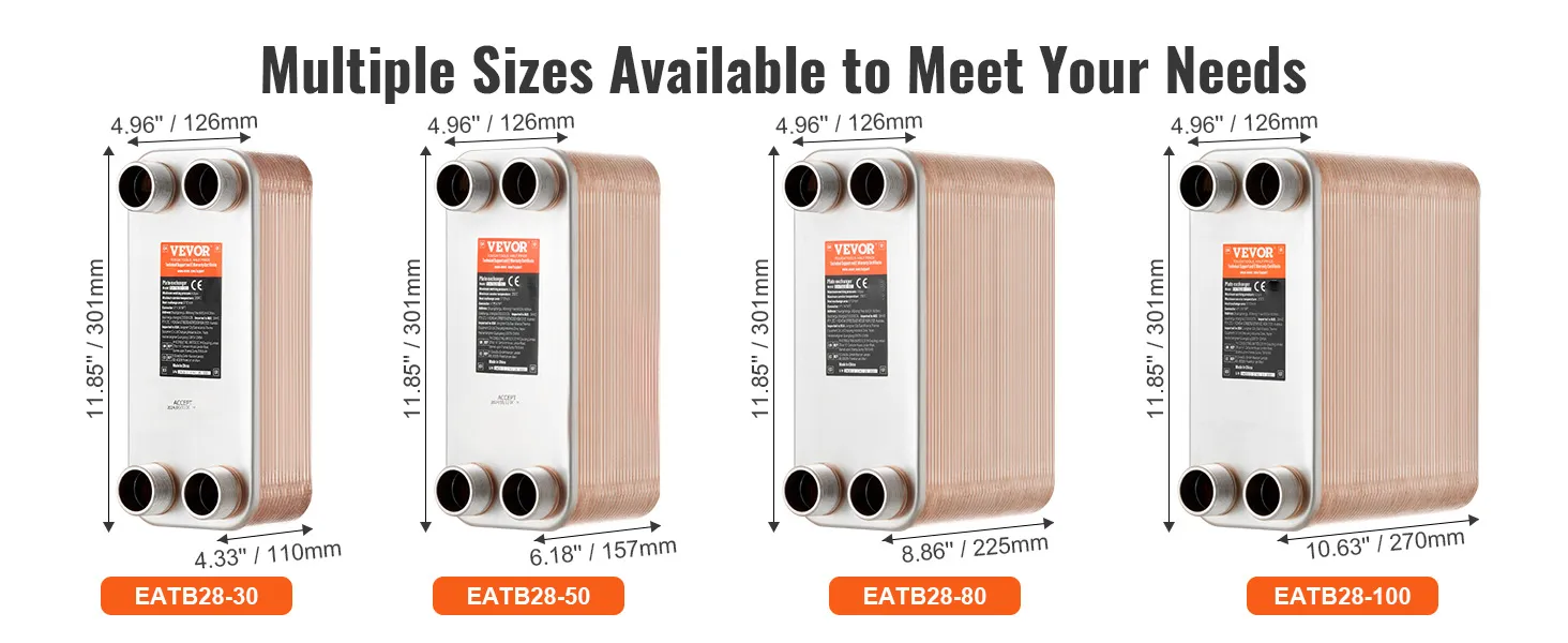 VEVOR Heat Exchanger, 5"x 12" 100 Plates Brazed Plate Heat Exchanger, Copper/316L Stainless Steel Water To Water Heat Exchanger For Floor Heating, Water Heating, Snow Melting, Beer Cooling
