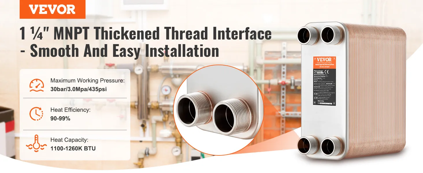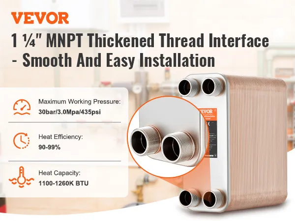 Mūsu siltummainim ir 1 ¼ collu MNPT saskarne ar gludām vītnēm, kas nodrošina vienkāršu un ērtu savienojumu.