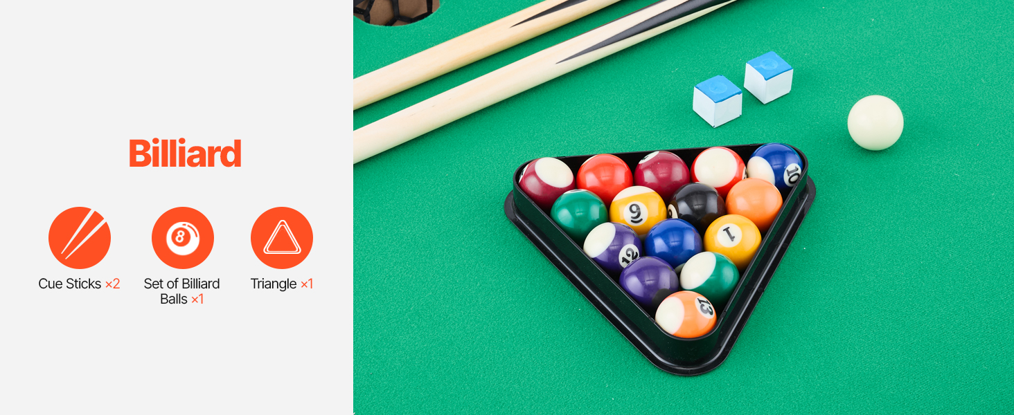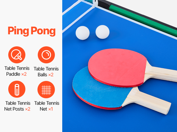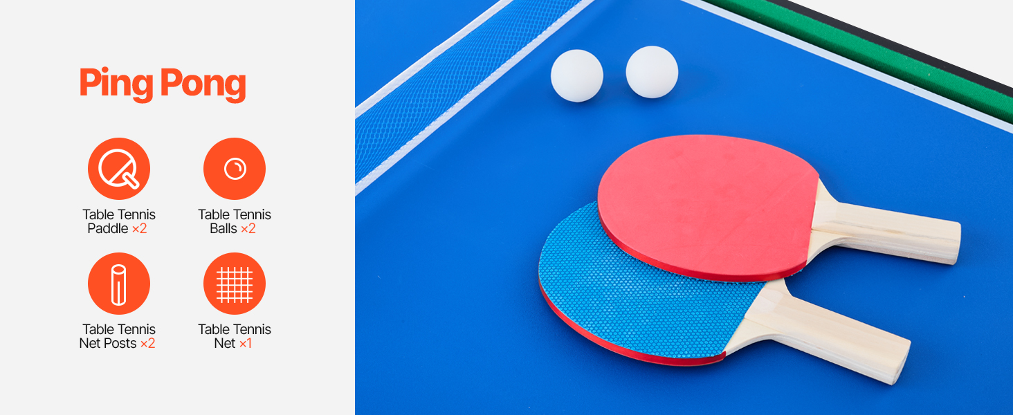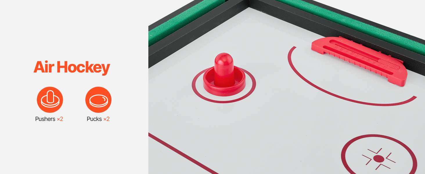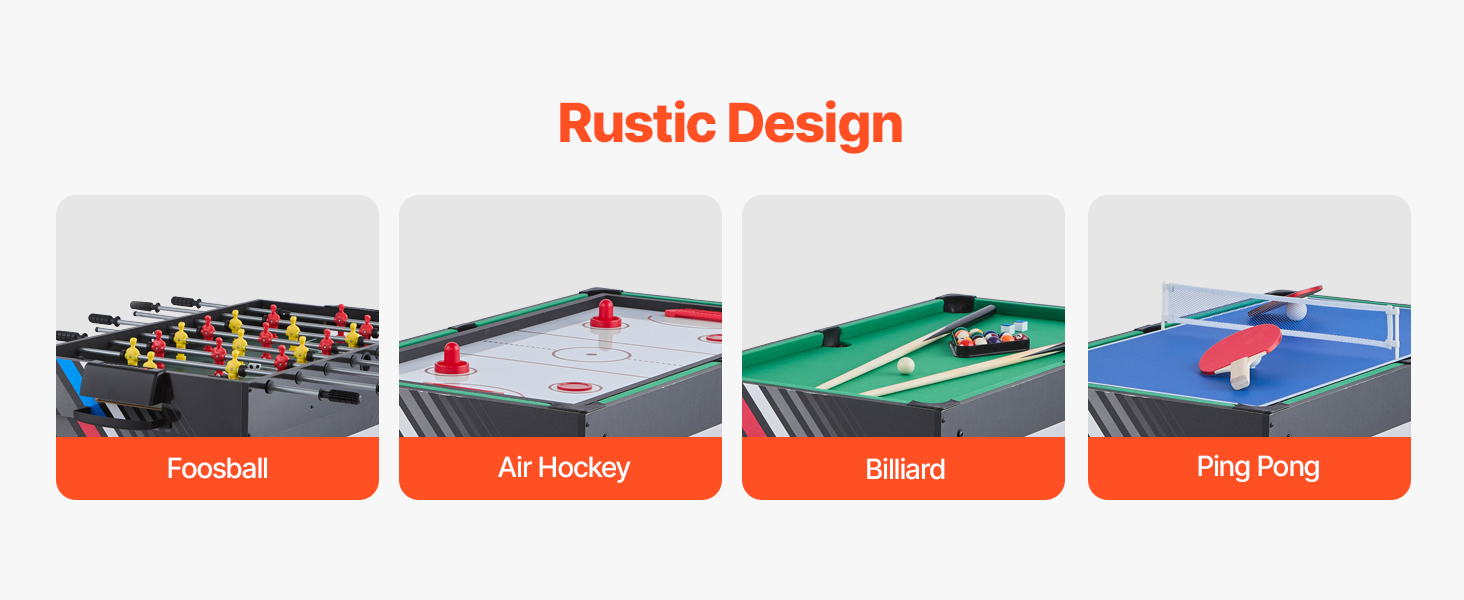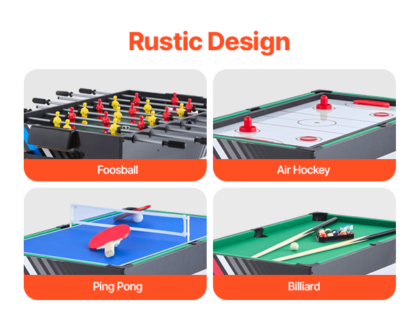 Šis 4-vienā daudzfunkcionālais spēļu galds apvieno gaisa hokeju, galda futbolu, biljardu un galda tenisu vienā pieejamā spēļu galdā, kas paredzēts stundām ilgai ģimenes izklaidei. Tā kompaktais dizains (48x27,2x32,3 collas / 122x69x82 cm) ar sakraujamu konstrukciju bez piepūles ietaupa vietu.