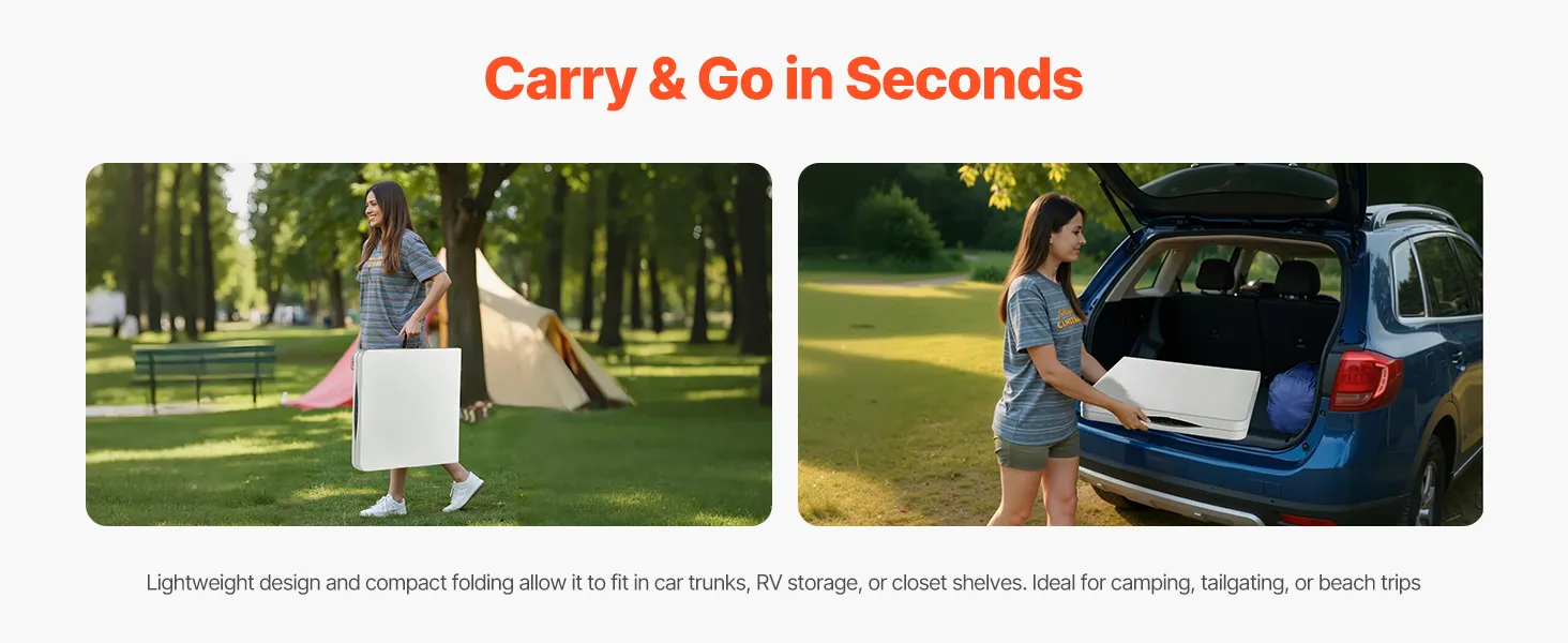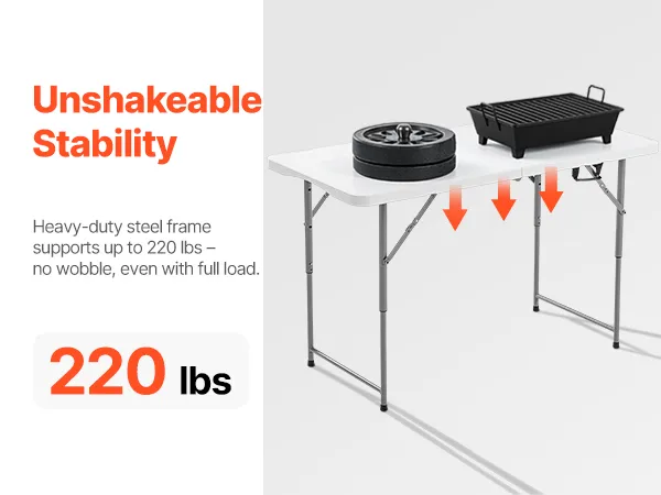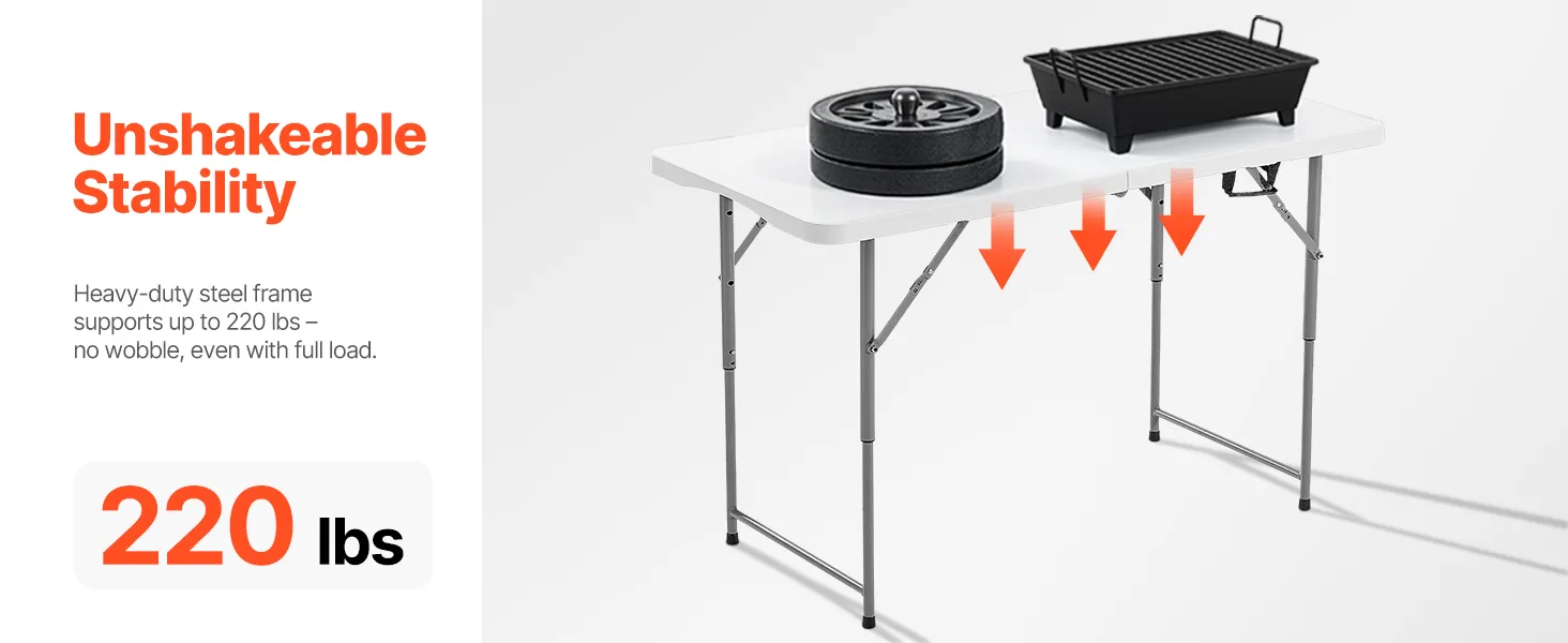 J: Kādi ir galda virsmas izmēri?A: Galda virsmas garums ir 4 pēdas (48 collas / 122 cm), nodrošinot pietiekami daudz vietas ēdienreizēm, aprīkojumam vai aktivitātēm.J: Cik lielu svaru galds var izturēt? Vai tas ir stabils?A: Galds var izturēt svaru līdz 220 mārciņām (100 kg), un tam ir izturīgs rāmis ar kājām, kas neļauj šūpoties.J: Cik sver galds? Vai to ir viegli pārvietot?A: Galds ir viegls - 17,6 mārciņas / 8 kg - un kompakti salokās, tāpēc to ir viegli pārnēsāt, izmantojot iebūvēto rokturi, un uzglabāt automašīnas bagāžniekā vai skapī.J: Vai ir nepieciešama montāža? Cik sarežģīta tā ir?A: Nav nepieciešami instrumenti — vienkārši izpildiet iekļauto uzstādīšanas rokasgrāmatu montāžai. Uzstādīšana ir ātra un intuitīva ikvienam.