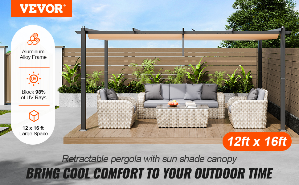 VEVOR 12'x16' Outdoor Retractable Pergola with Canopy, Aluminum Pergola with Retractable Canopy, Modern Pergola with Sun Shade Canopy for Patios, Gardens, Decks, Backyards (Beige)