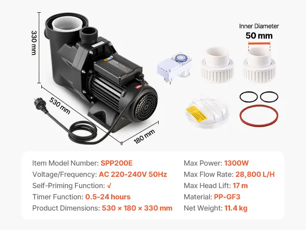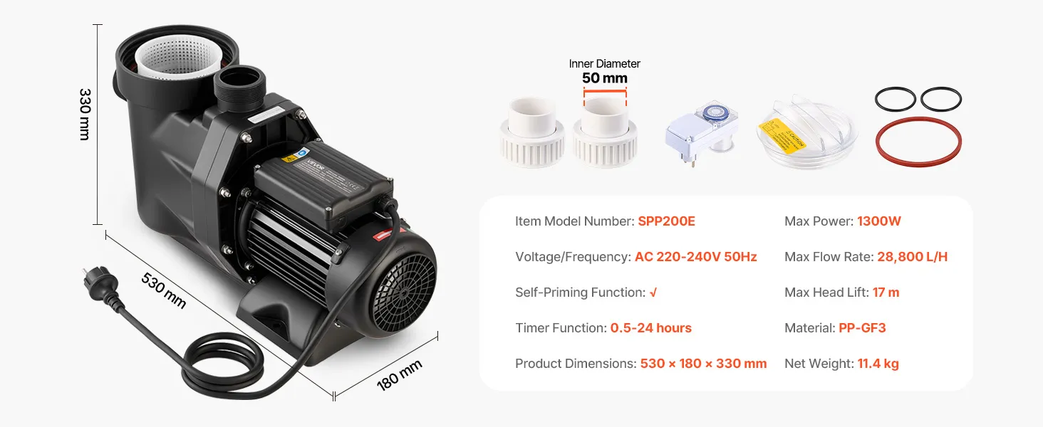 VEVOR 1300W baseina sūknis ar taimeri un filtru, 28 800 l/h, 17 m pacēlums, 220–240V virszemes baseiniem, spa un burbuļvannām