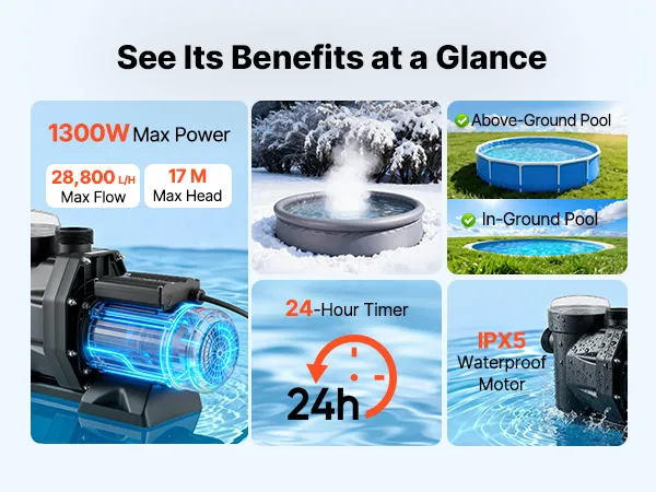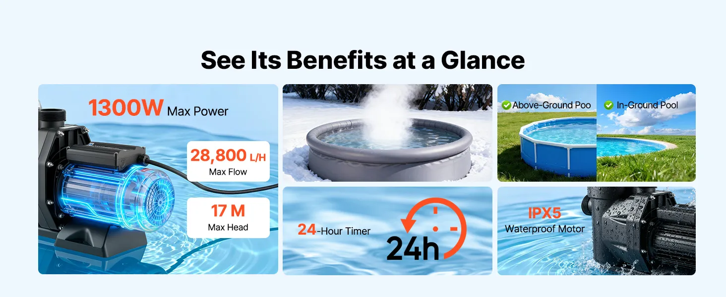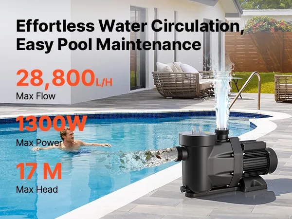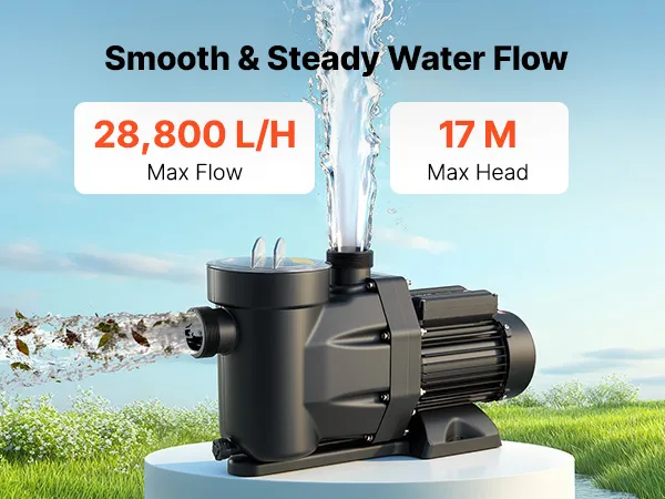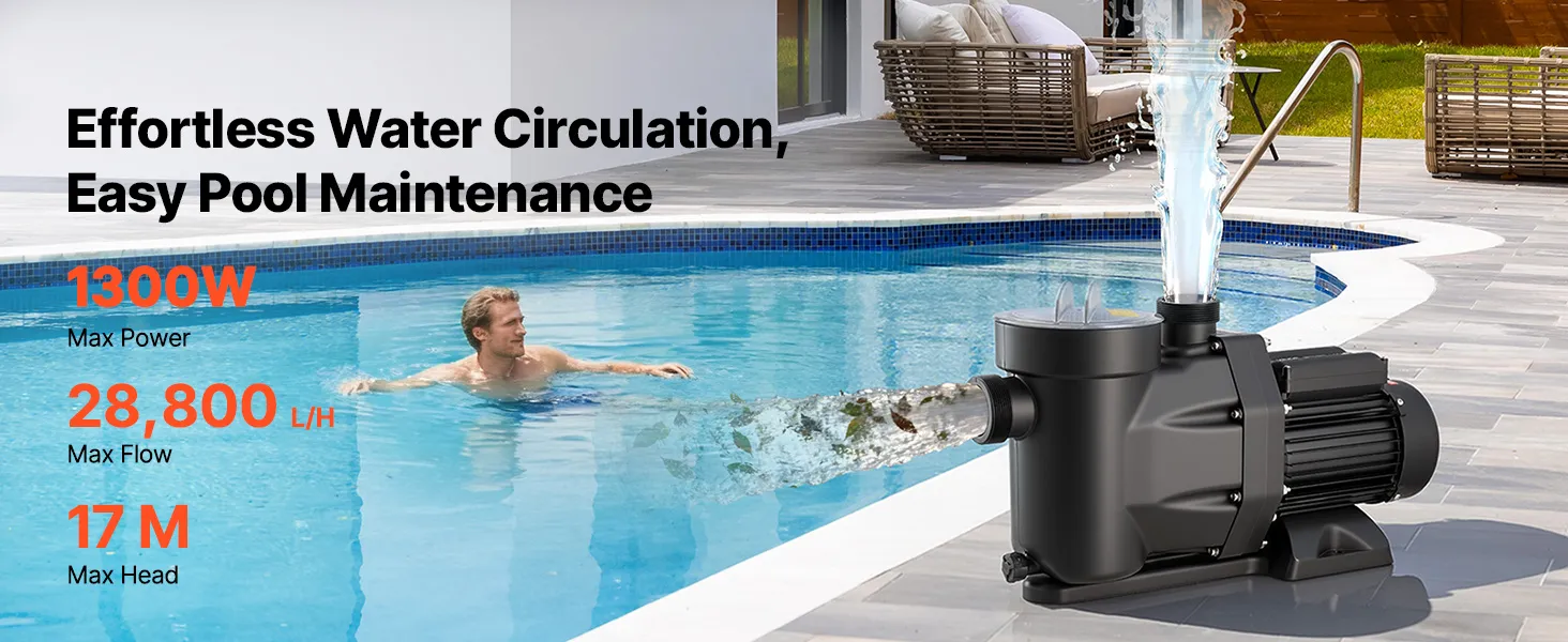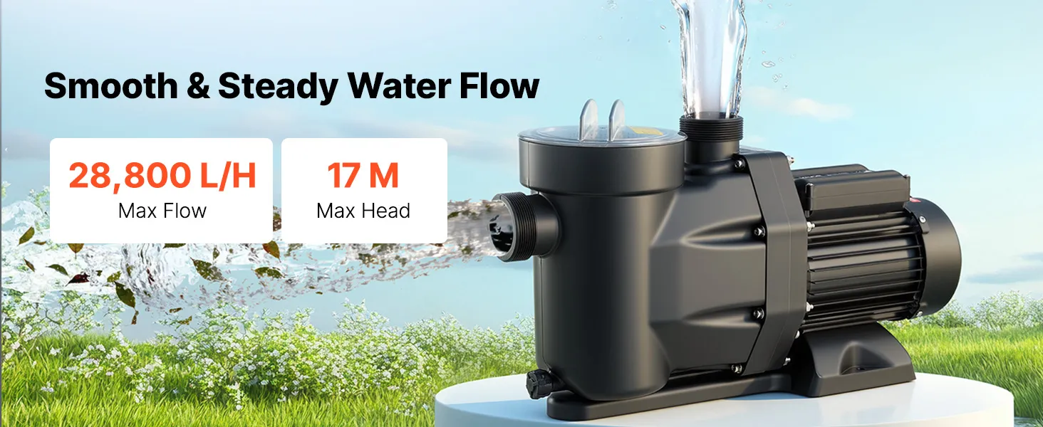 • Powerful 1300W Pool Pump: This pool filter pump features a copper motor for stable, high-performance, and quiet operation. With a max flow of 28,800 L/H and a max head of 17 m, it delivers efficient water circulation for a clean swimming experience