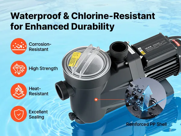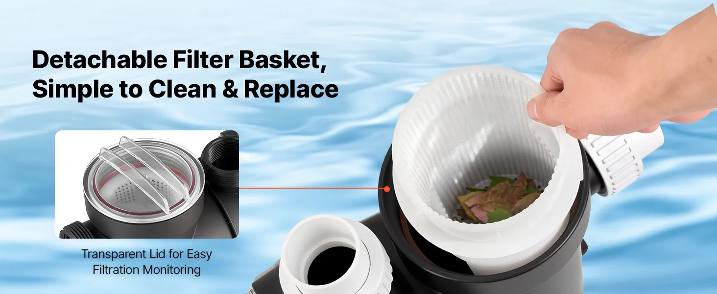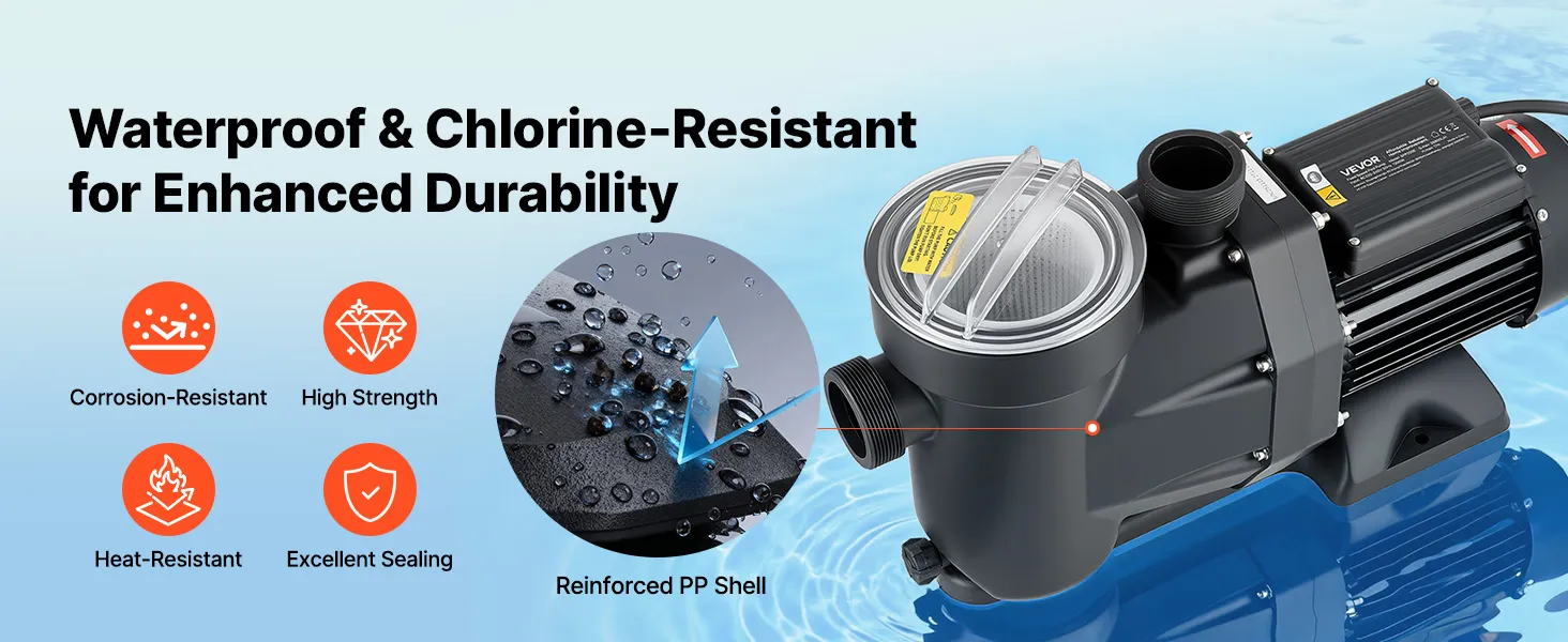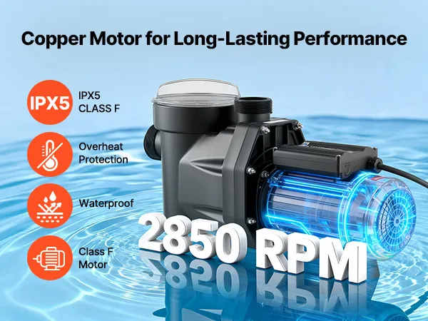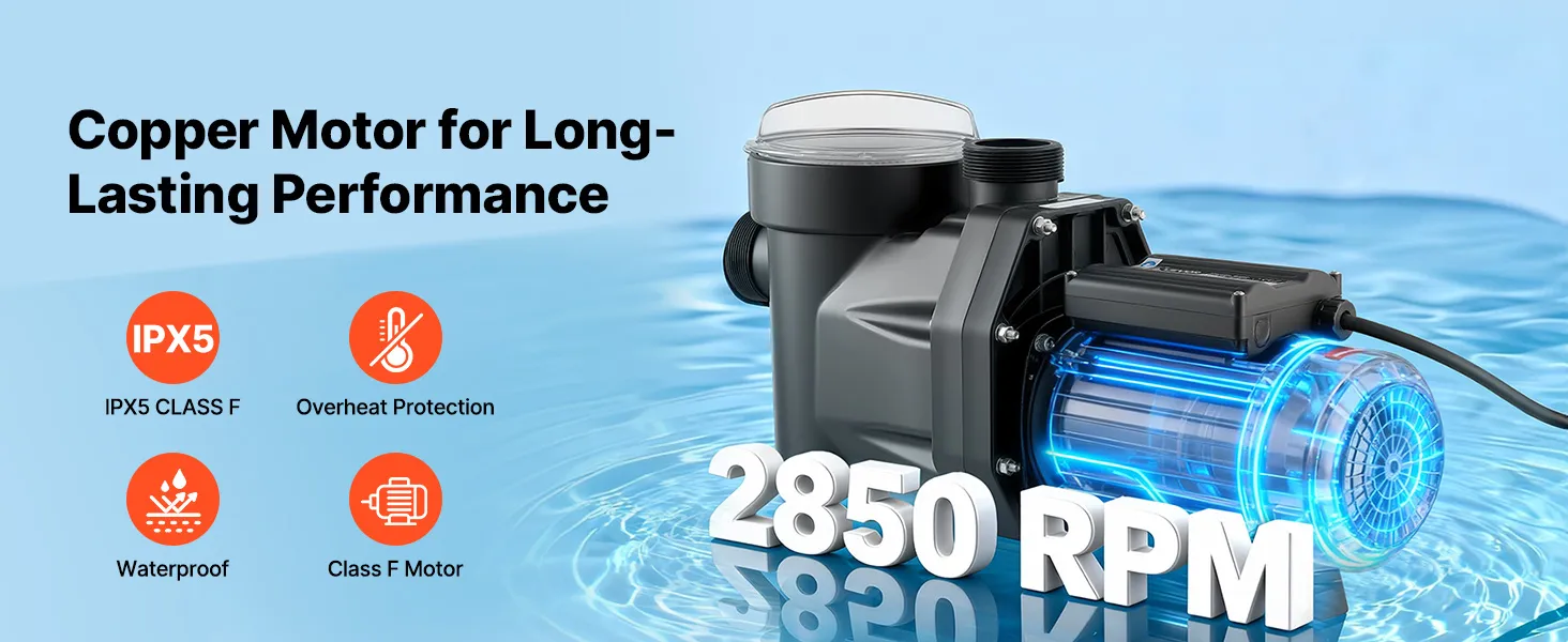 • Multi-Layer Protection: Equipped with a large filter basket to pre-filter debris and extend cleaning intervals. This pool pump is built with a reinforced thermoplastic housing, plus an IPX5 waterproof and Class F motor for reliable operation