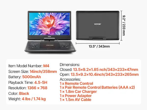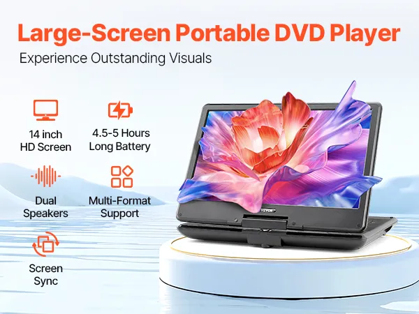 • HD Rotating Screen: The 14-inch screen with 1366 x 768 HD resolution provides clear images. Our portable DVD player supports 270° rotation and 180° folding, ensuring a comfortable viewing experience at home, in the car, or on the go, easy to carry