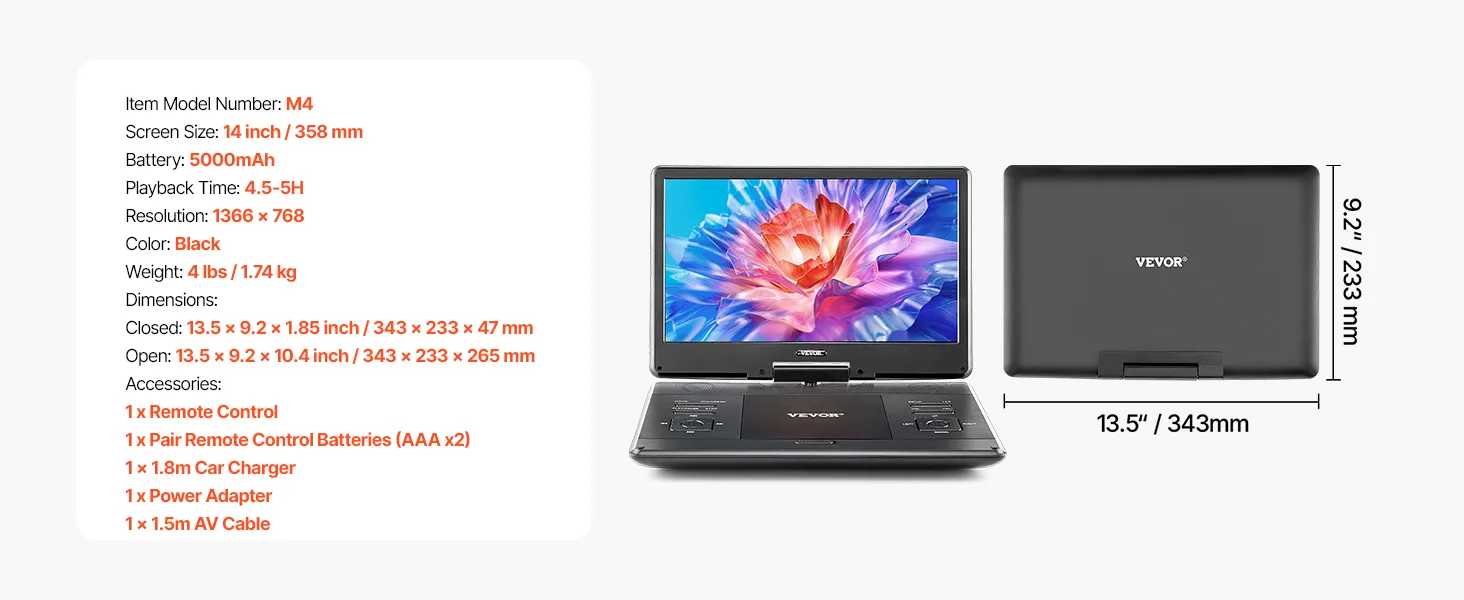 VEVOR 14" pārnēsājamais DVD atskaņotājs ar HD grozāmu ekrānu, 5000mAh akumulatoru, USB/SD/TV atbalstu, tālvadību, lādētāji