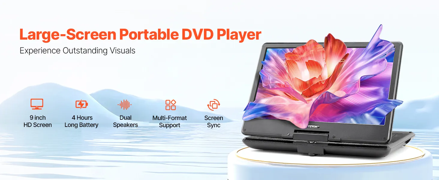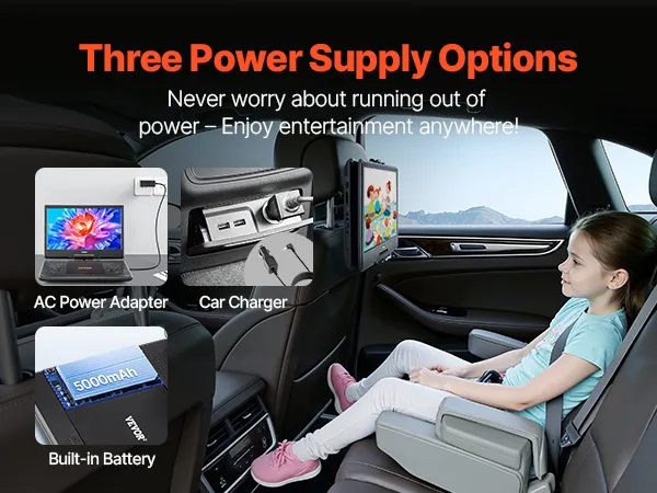 • Ilgstošs akumulatora darbības laiks: Aprīkots ar iebūvētu 5000 mAh uzlādējamu akumulatoru, šis pārnēsājamais DVD atskaņotājs ar ekrānu nodrošina līdz pat 4,5–5 stundām atskaņošanas laika, apmierinot jūsu vajadzības. Tam ir arī maiņstrāvas adapteris un automašīnas lādētājs uzlādei, atrodoties ceļā.