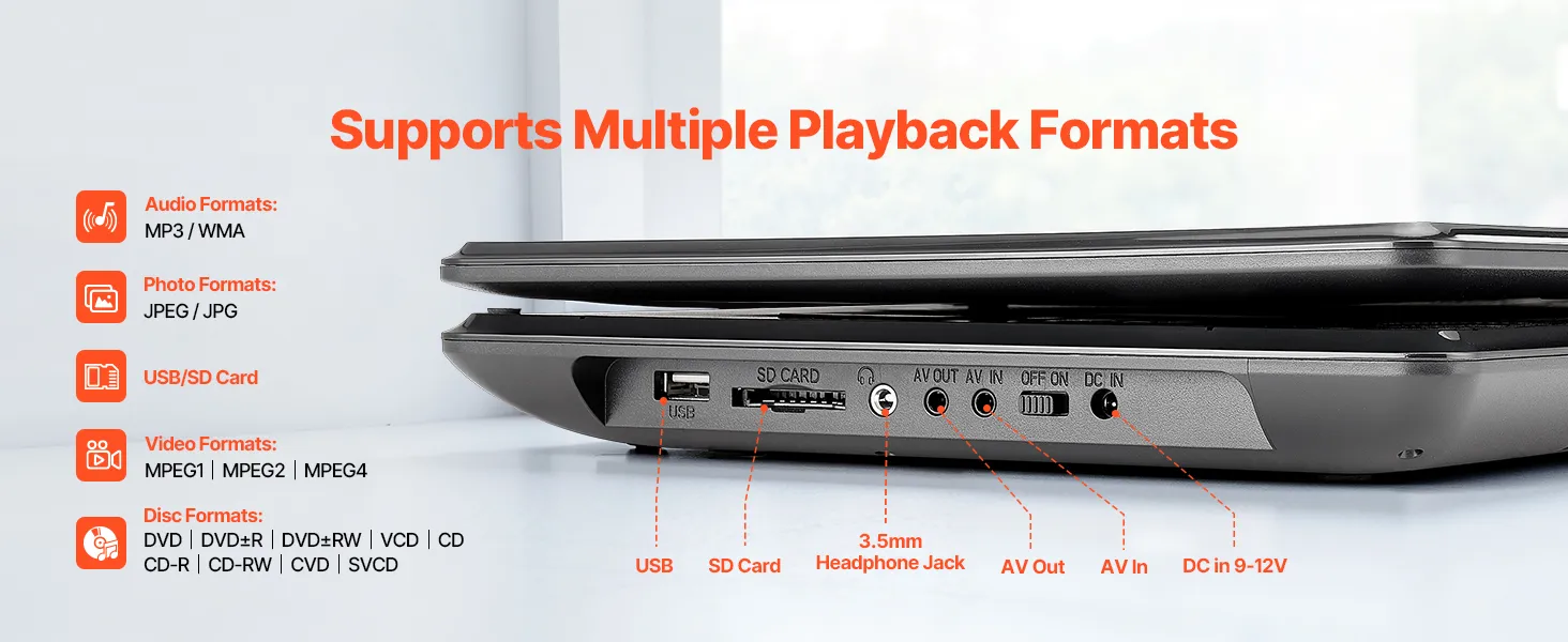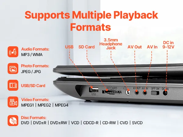 • Atbalsta vairākus formātus: Ceļojumu DVD atskaņotājs var atskaņot visu reģionu diskus, tostarp DVD, DVD±R, DVD±RW, VCD, CD, CD-R, CD-RW, CVD un SVCD. Tas atbalsta arī USB un SD kartes (līdz 32 GB) un tādus formātus kā MPEG1, MPEG2, MPEG4, MP3, WMA, JPEG, JPG.