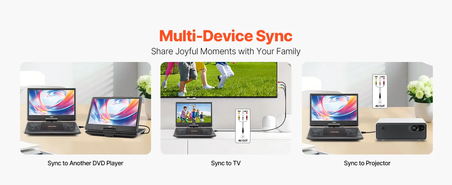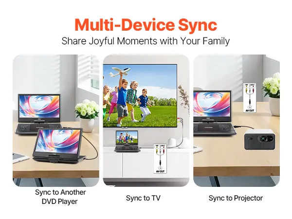 • Ekrāna sinhronizācijas atskaņošana: Izmantojot AV izejas funkciju, varat viegli pievienot portatīvo DVD atskaņotāju automašīnai televizora ekrānam, lai iegūtu plašāku skatīšanās pieredzi. Ideāli piemērots ģimenes salidojumiem vai personīgai filmu skatīšanai, nodrošinot kinoteātra kvalitātes pieredzi.