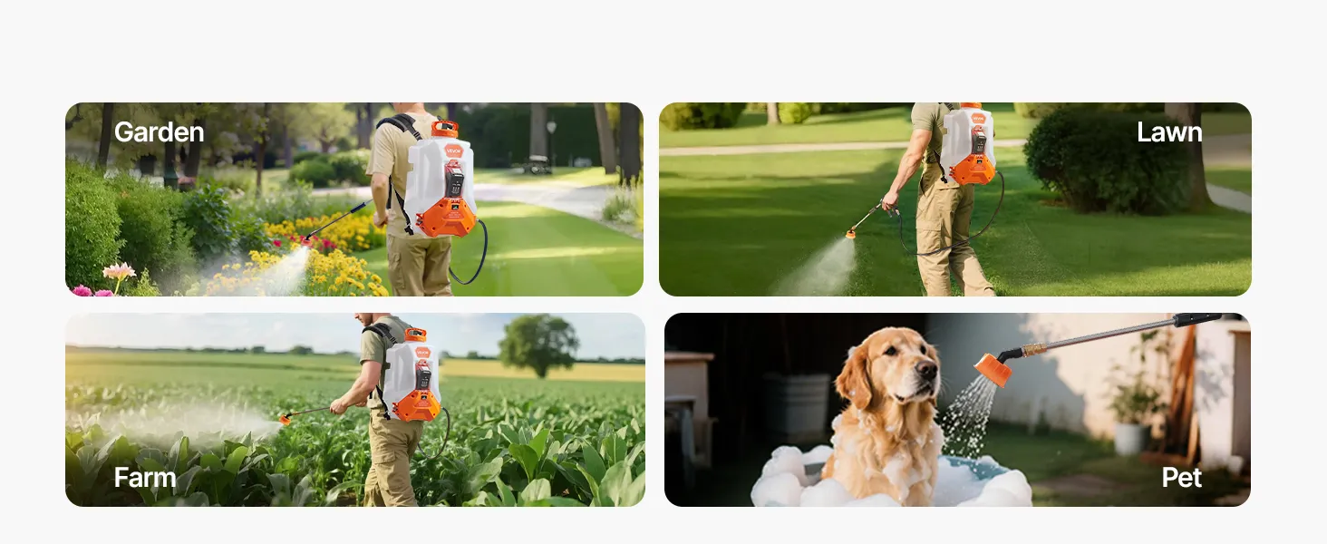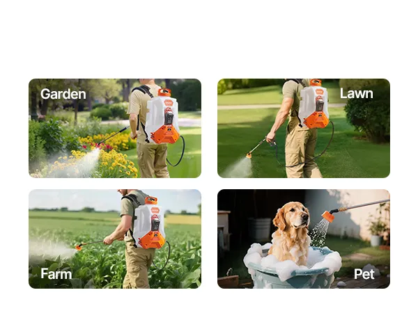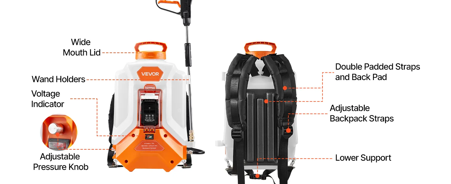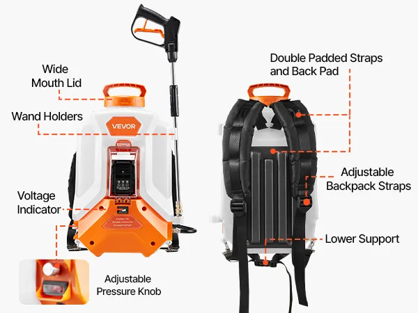 Mugursomas smidzinātājs nodrošina efektīvu un izturīgu lietošanu ar 4 stundu darbības laiku. Dārza smidzinātājam ir smidzināšanas stieņi precīzai izsmidzināšanai, regulējams spiediens (0–90 PSI) un ergonomisks dizains komfortam. Komplektā ietilpst 8 sprauslas daudzpusīgai lietošanai dārzkopībā, tīrīšanā un pesticīdu izsmidzināšanā.