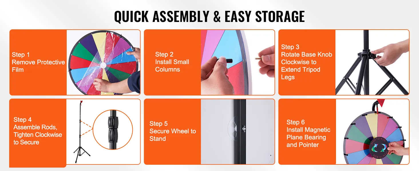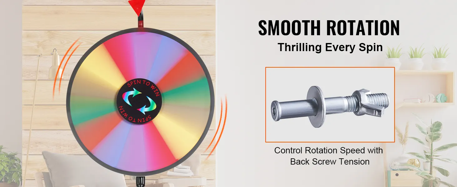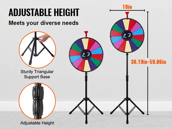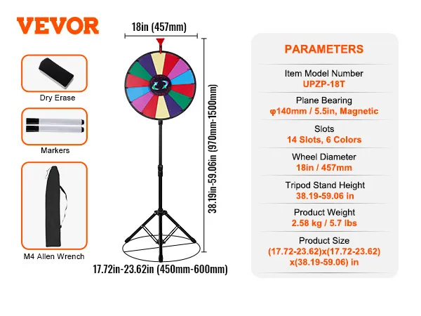 Neatkarīgi no tā, vai esat uzņēmums, pasākumu organizators vai izklaides vieta, VEVOR balvu rats parūpēsies par visu. Ar pielāgojamiem slotiem, vienmērīgu griešanos, pārnesamību, aizraujošām klikšķināšanas skaņām un daudzajiem aksesuāriem mūsu produkts garantē unikālu spēļu pieredzi un pasākuma iespaidu.