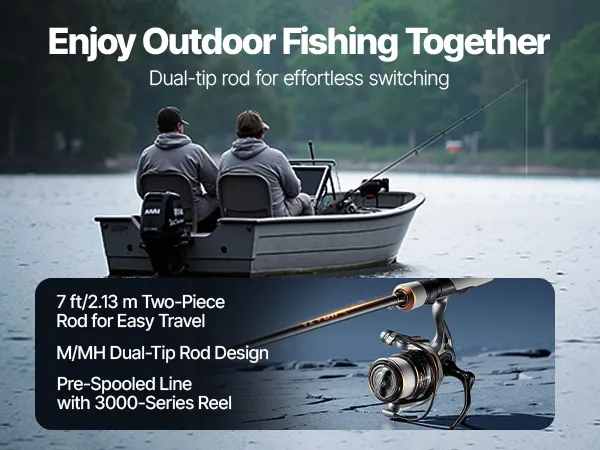 The 7ft/2.13m, 2-piece rod and reel combo includes an M/MH dual tip design for flexible performance in different fishing environments. The pre-spooled 3000 reel requires no additional line prep, and the IM7 carbon fiber rod is lightweight, durable, and responsive to various conditions.