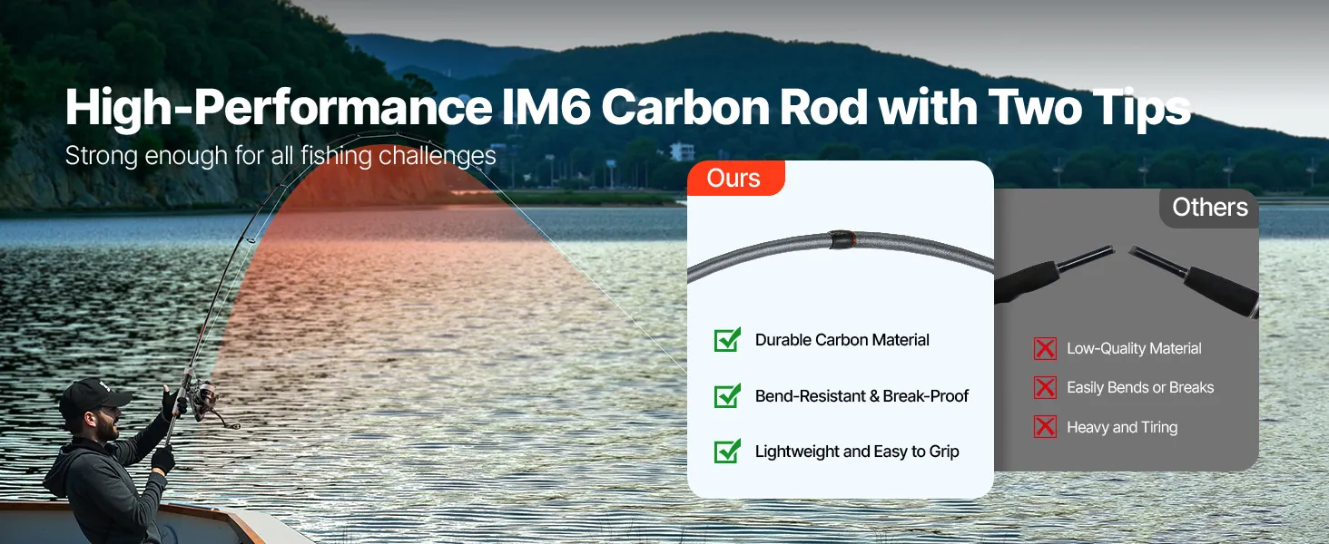 This rod combines durable carbon fiber and a dual tip design for superior bending resistance and durability. With its lightweight design, you'll experience less fatigue even after hours of use, easily handling the strong pulls from a variety of fish for a more enjoyable fishing experience.