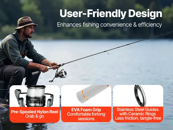 The reel of our fishing rod and reel comes pre-spooled with nylon line, so you can start fishing right away. The EVA foam grip ensures a secure, comfortable hold, reducing fatigue. The stainless steel guides with ceramic inserts reduce friction and wear for smoother casting and retrieval.