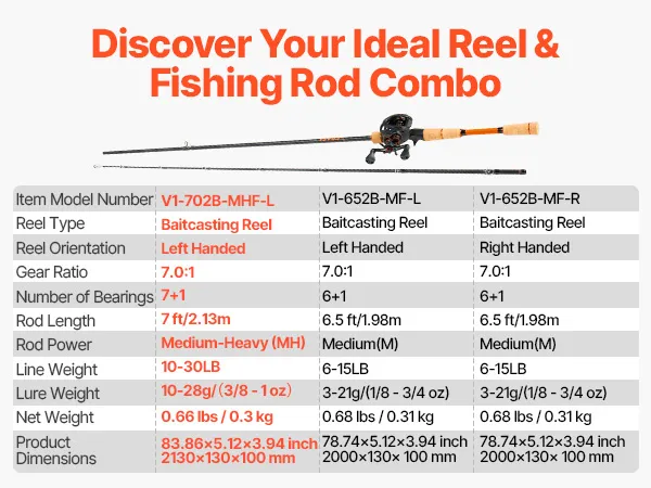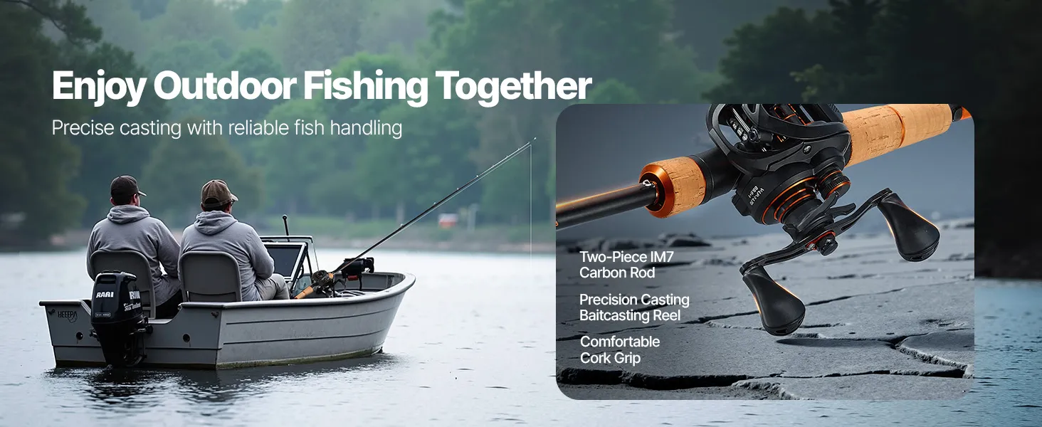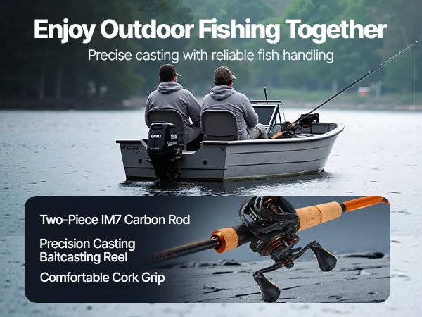 Our rod and fishing reel combo features a 2-piece IM7 carbon rod, lightweight and suitable for various fishing scenarios. Paired with a precision casting reel for smooth operation, the cork handle ensures comfort, and the reel's 7+1 ball bearings and 7.0:1 gear ratio guarantee smooth retrieval.