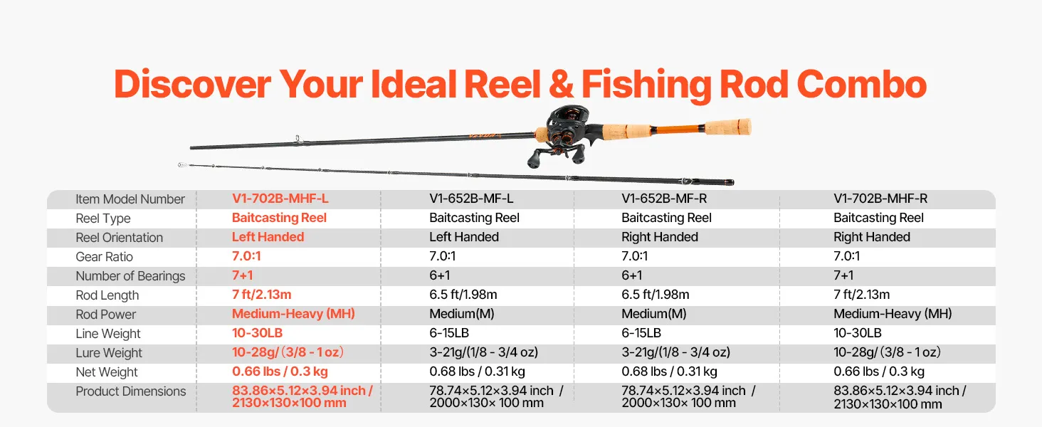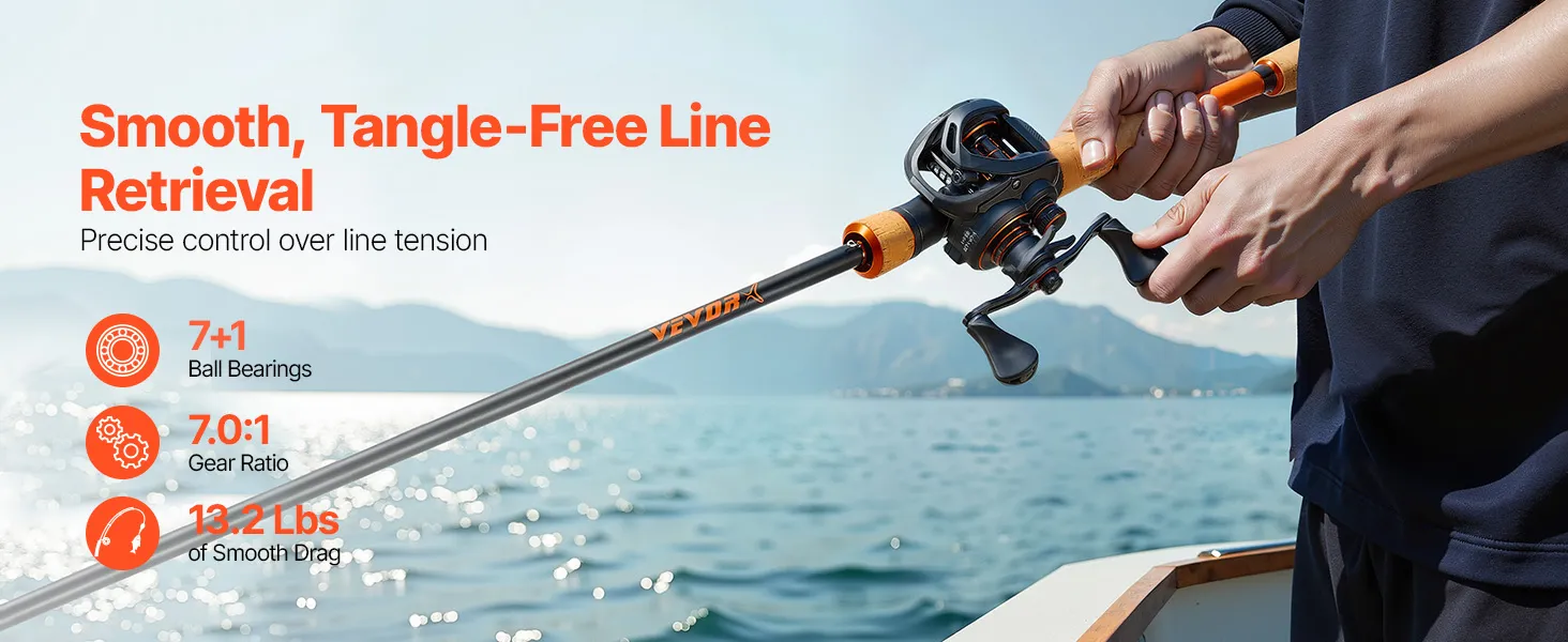 VEVOR Rod and Fishing Reel Combo, IM7 Carbon Fiber Baitcasting Rod and Reel Combo, Bass Fishing Pole with 7+1 BB System, 7.0:1 Gear Ratio, Cork Handle, Stainless Steel Guides with Ceramic Rings