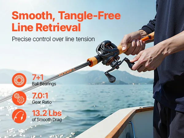 Featuring 7 + 1 ball bearings and a 7.0:1 gear ratio, this fishing rod and reel ensures smooth and efficient line retrieval with no interruptions. The 13.2 lbs/6 kg drag force allows for precise line tension control, making it easy to manage both intense fish struggles and easy hook retrieval