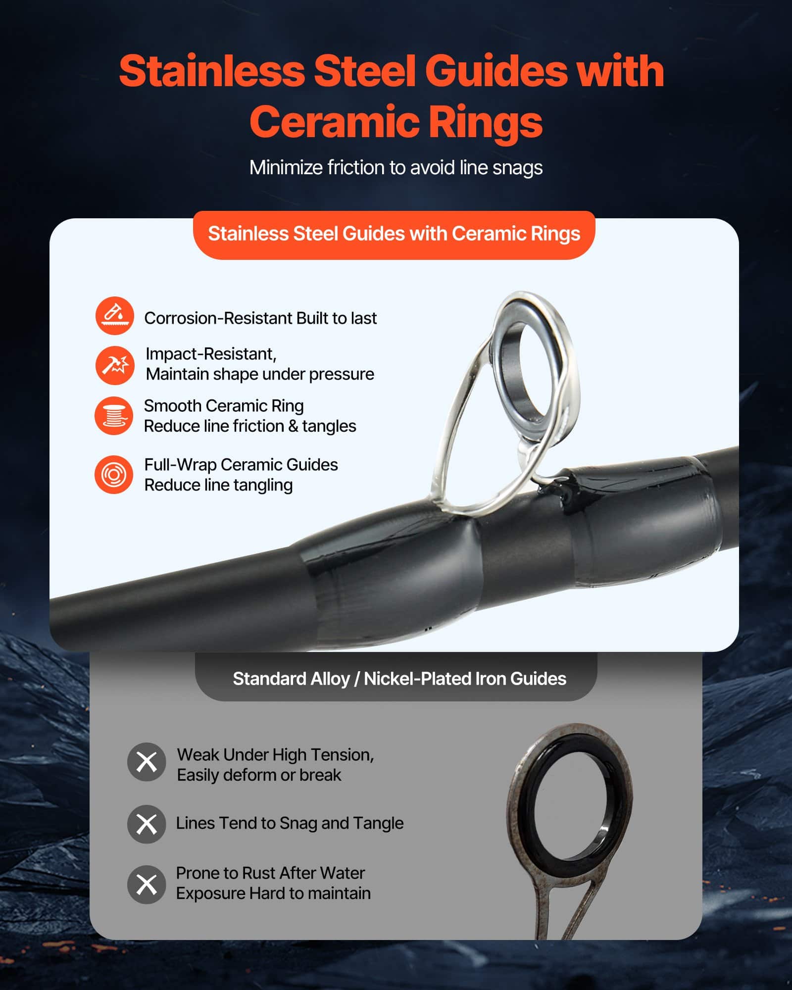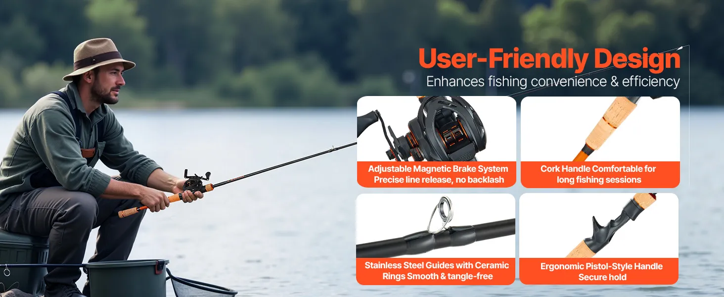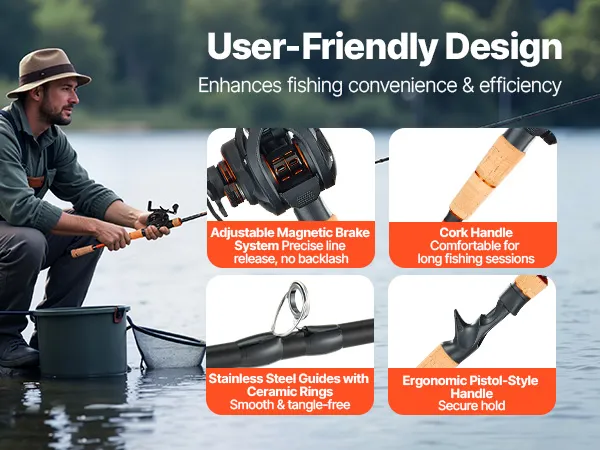 This fishing combo comes with an adjustable magnetic brake system for precise line release, reducing backlash. The cork handle provides a comfortable, non-slip grip, even for long periods, while ceramic ring guides minimize line friction and prevent tangling, ensuring smooth and efficient operation.