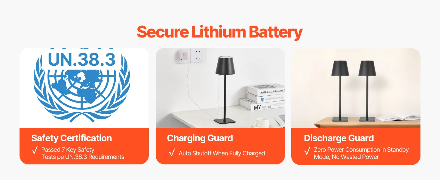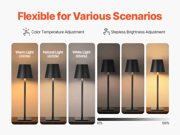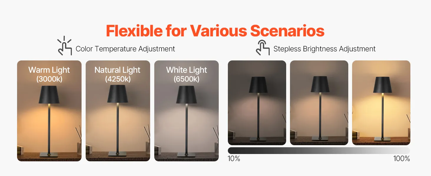 • Bezvadu un pārnēsājams: iebūvētais akumulators novērš vadu radītās raizes. Bezvadu lampas vieglā konstrukcija ļauj to ērti pārvietot, tāpēc tā ir ideāli piemērota guļamistabām, ēdamistabām, terasēm, āra aktivitātēm, restorāniem, bāriem un kempingiem, lai radītu siltu un mājīgu atmosfēru.