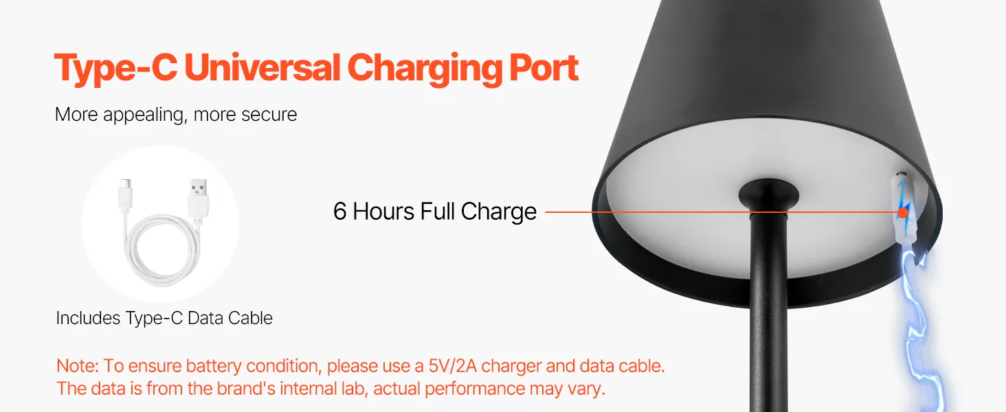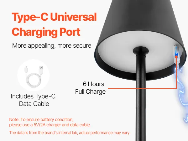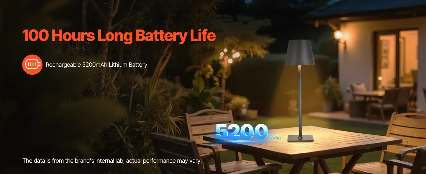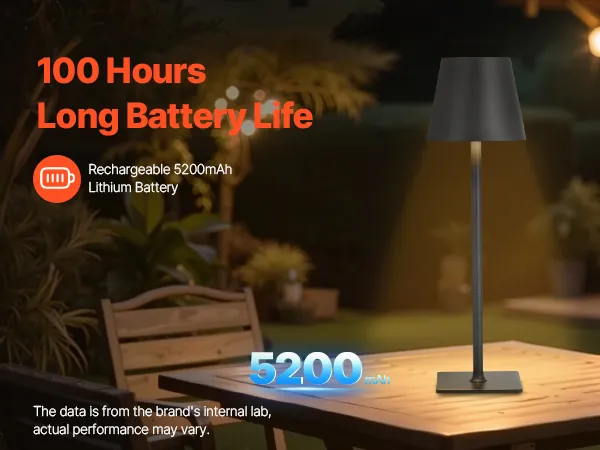 • Iebūvēts liels akumulators: bezvadu galda lampa ir aprīkota ar divām 2600 mAh uzlādējamām baterijām, kas nodrošina līdz 8 stundām darbību spilgtā režīmā un līdz 100 stundām ar zemu jaudu. Pilnībā uzlādējas 6 stundās, izmantojot komplektā iekļauto C tipa kabeli.