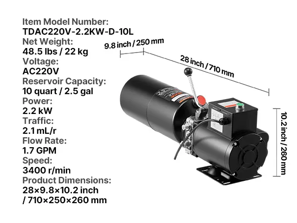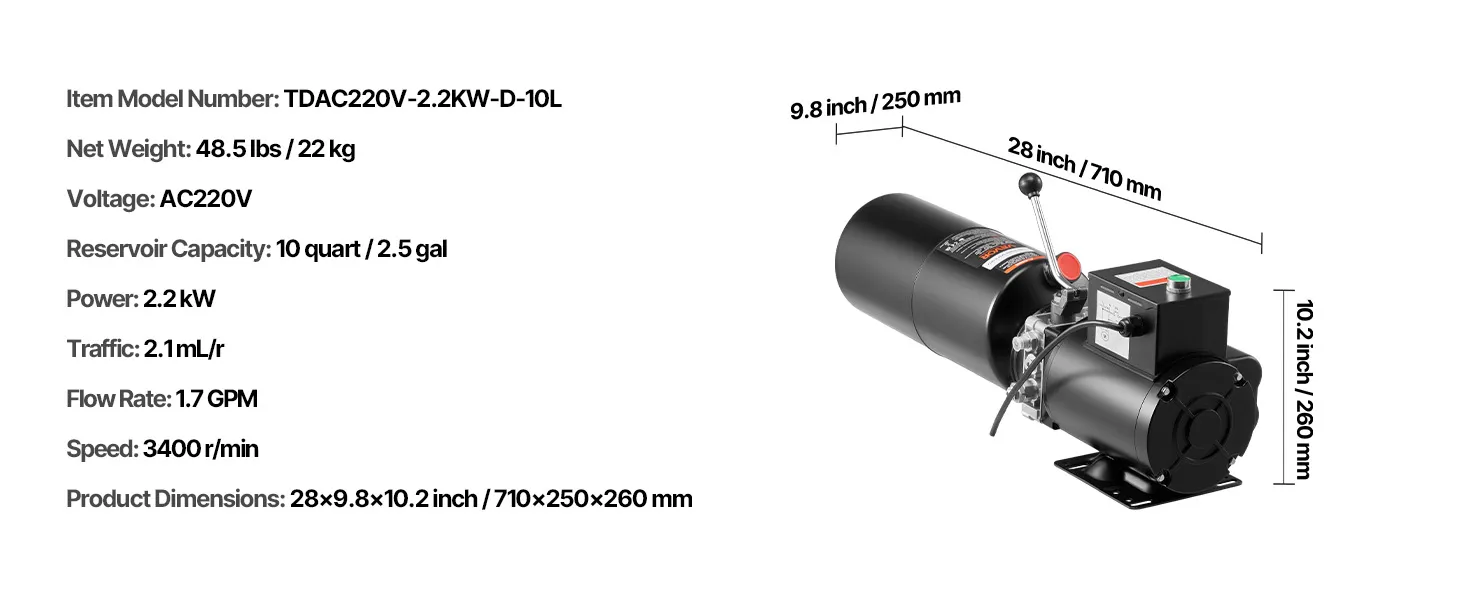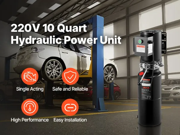 VEVOR Hydraulic Pump Power Unit, AC 220V, 10 Quart Single Acting Hydraulic Unit, 6.3 L/min Oil Flow, Max Discharge Pressure 22 MPa for Dump Truck, Auto Repair Garage, Car Lifting Platforms, Black