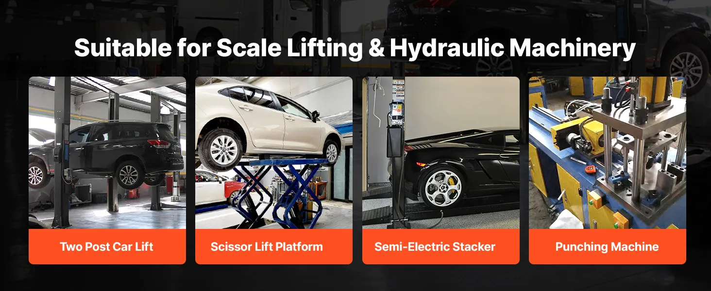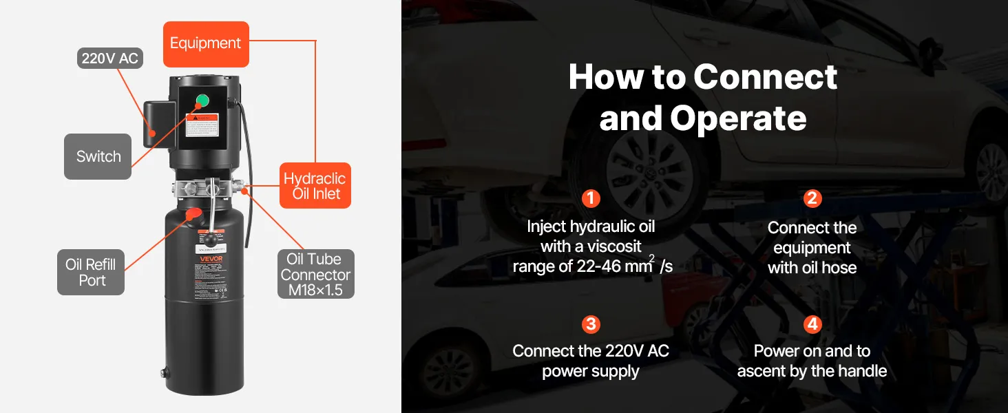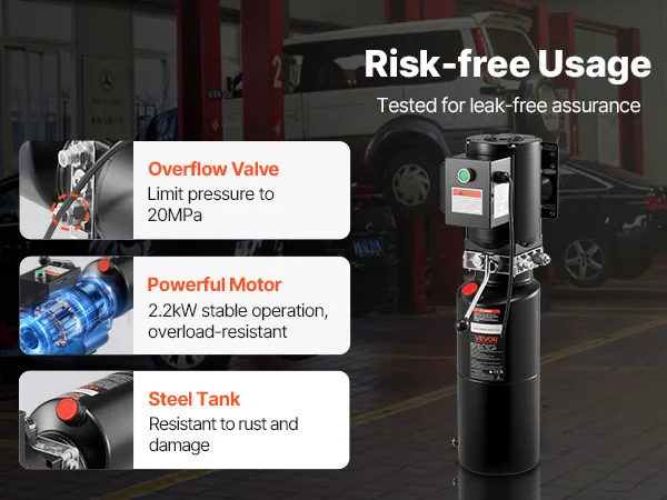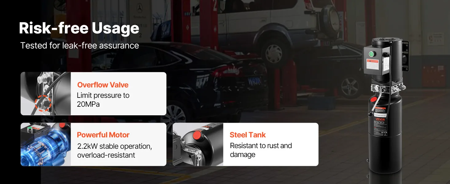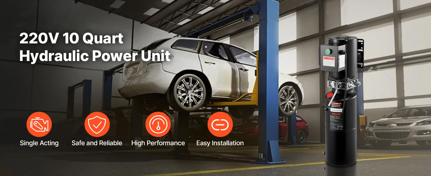 Ar lielo tvertni un jaudīgo motoru šī hidrauliskā spēka iekārta ir ideāli piemērota smago transportlīdzekļu pacelšanai. Vienvirziena darbības konstrukcija nodrošina ātru iedarbināšanu un vienmērīgu, stabilu darbību ar minimāliem pārtraukumiem.