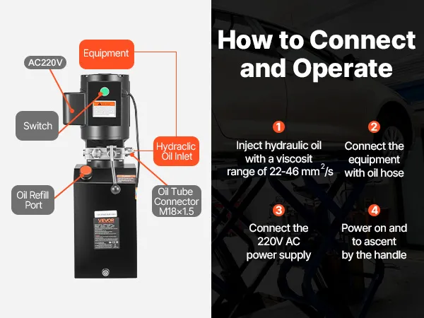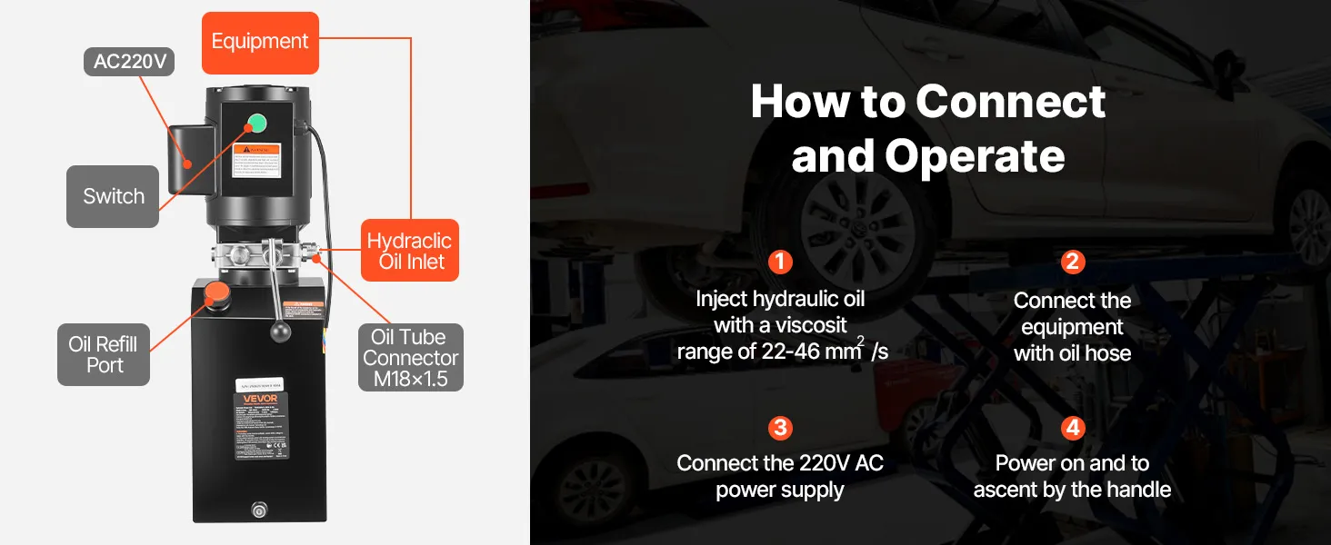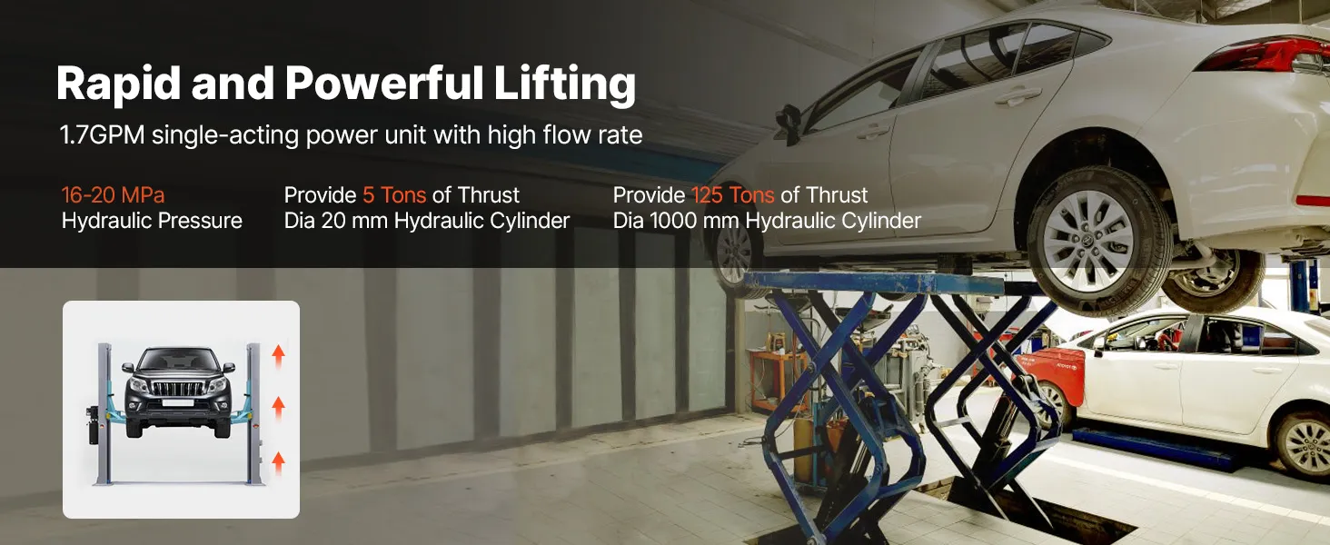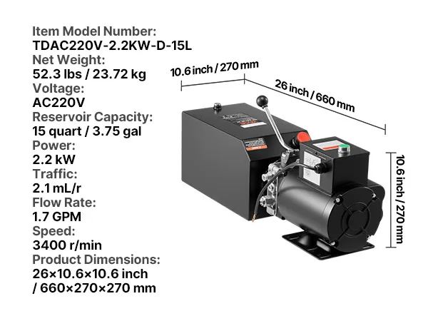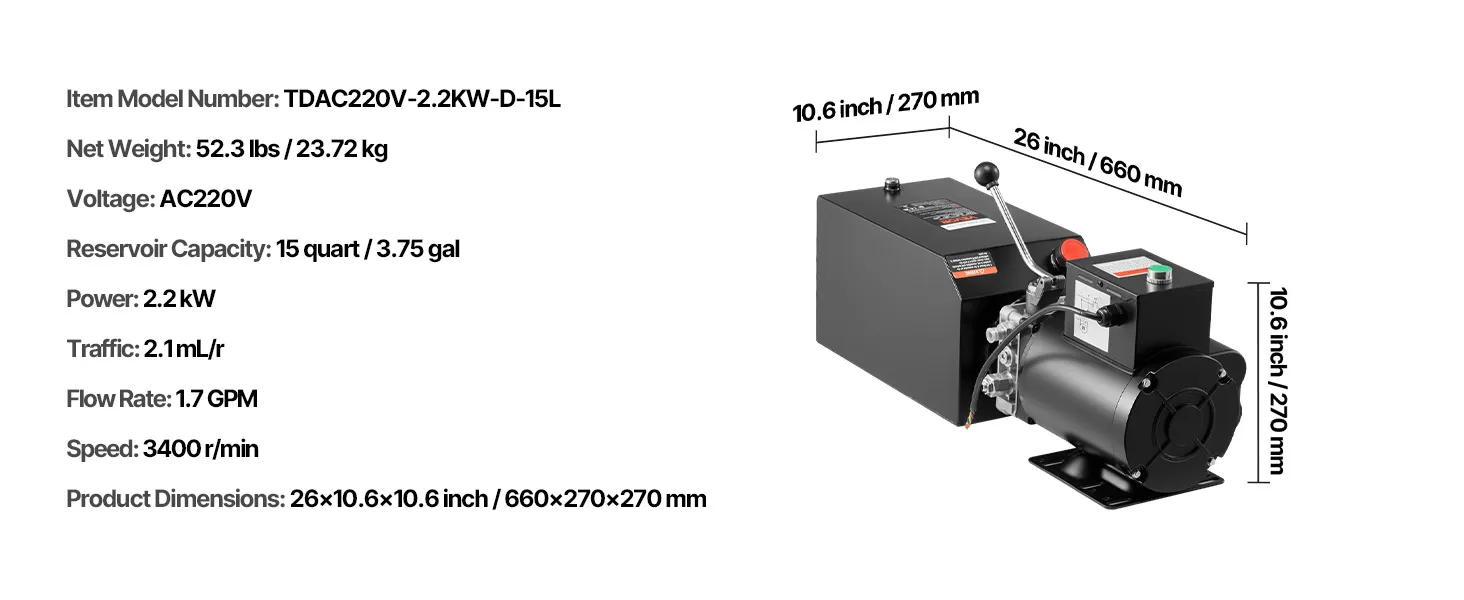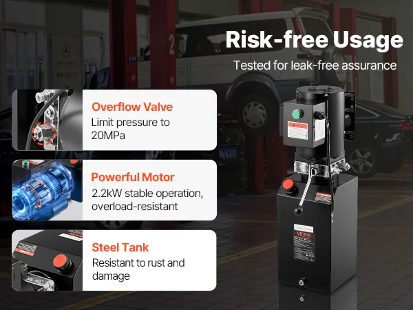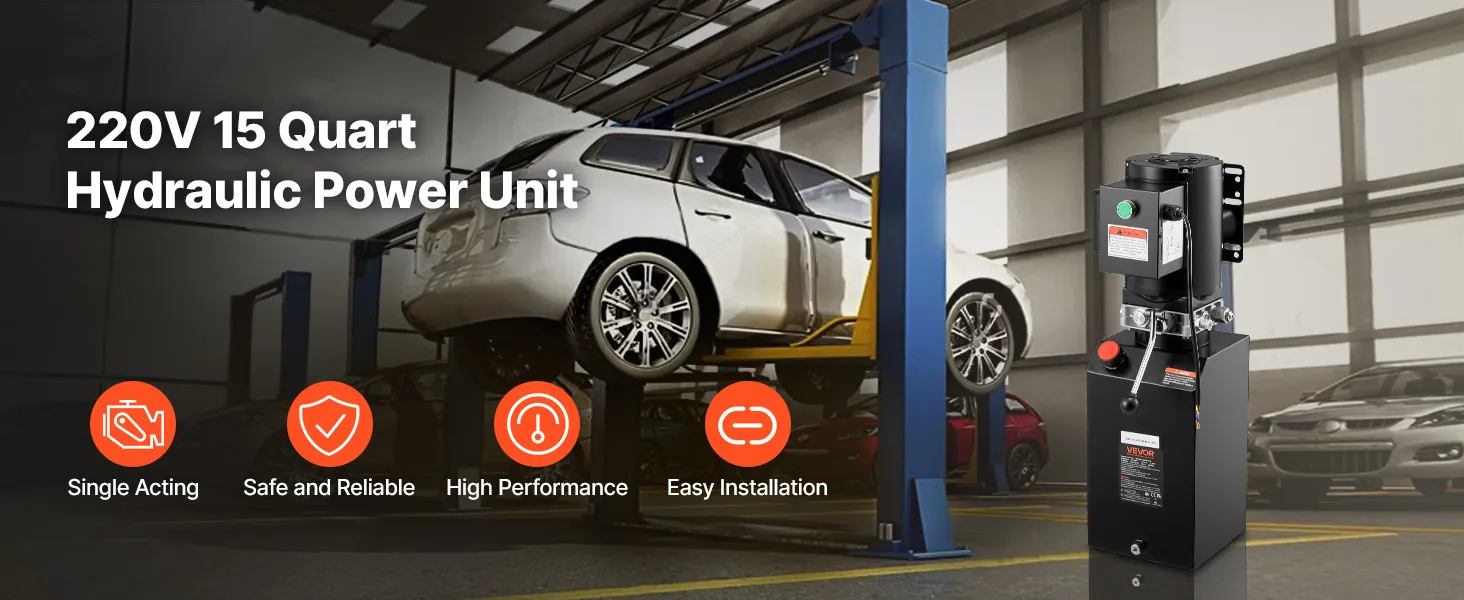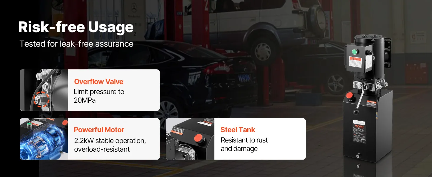 Ar lielo tvertni un jaudīgo motoru šī hidrauliskā spēka iekārta ir ideāli piemērota smago transportlīdzekļu pacelšanai. Vienvirziena darbības konstrukcija nodrošina ātru iedarbināšanu un vienmērīgu, stabilu darbību ar minimāliem pārtraukumiem.