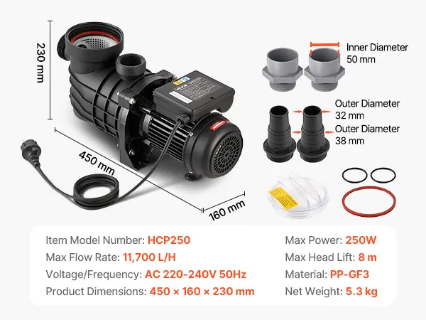 VEVOR Above Ground Pool Pump, 250W, 11,700 L/H Max Flow Single Speed Swimming Pool Pump, AC 220-240V, 2850 RPM, 8 m Max Head Lift, with Filter Basket & Lid, for Above Ground Pools, Hot Tubs, and Spas