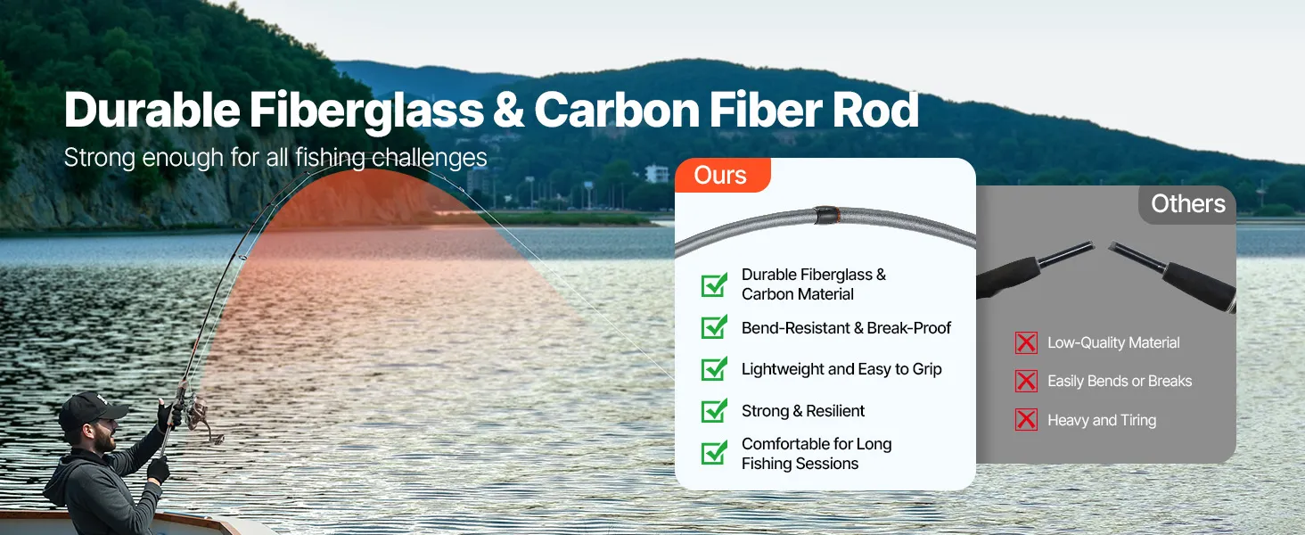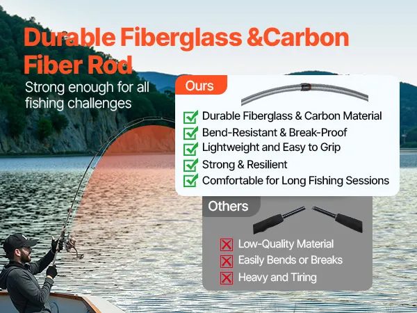 Made from robust fiberglass and carbon, this fishing rod provides excellent bending resistance and is less likely to break. Its lightweight design keeps you comfortable during extended use, allowing you to tackle strong fish pulls with ease and enjoy your fishing experience.