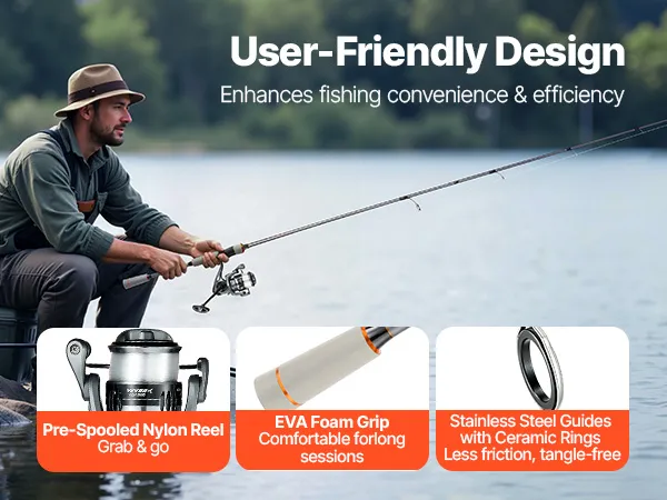 The reel of our fishing rod and reel comes pre-spooled with nylon line, so you can start fishing right away. The EVA foam grip ensures a secure, comfortable hold, reducing fatigue. The stainless steel guides with ceramic inserts reduce friction and wear for smoother casting and retrieval.