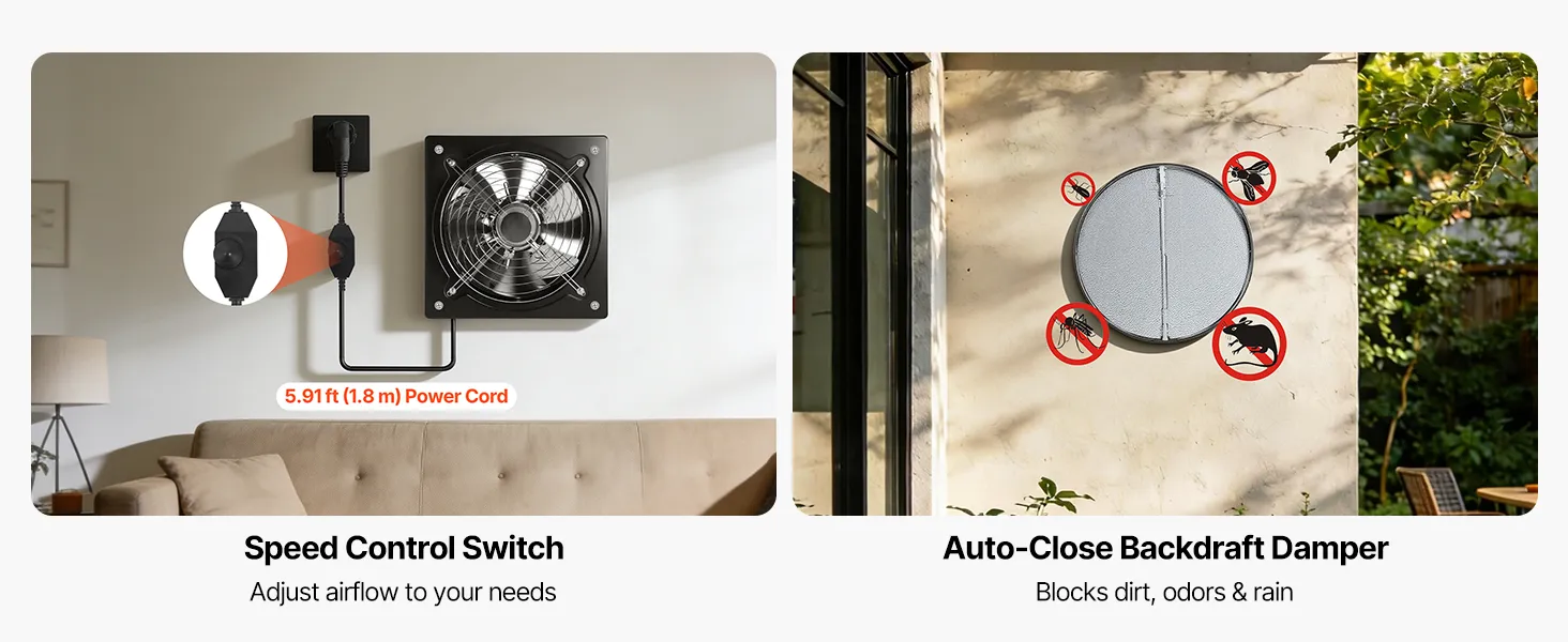 • Adjustable Fan Speed: The built-in speed control switch lets you adjust the fan airflow as needed, high speed for quick ventilation and low speed for quieter operation, ensuring comfort and flexibility