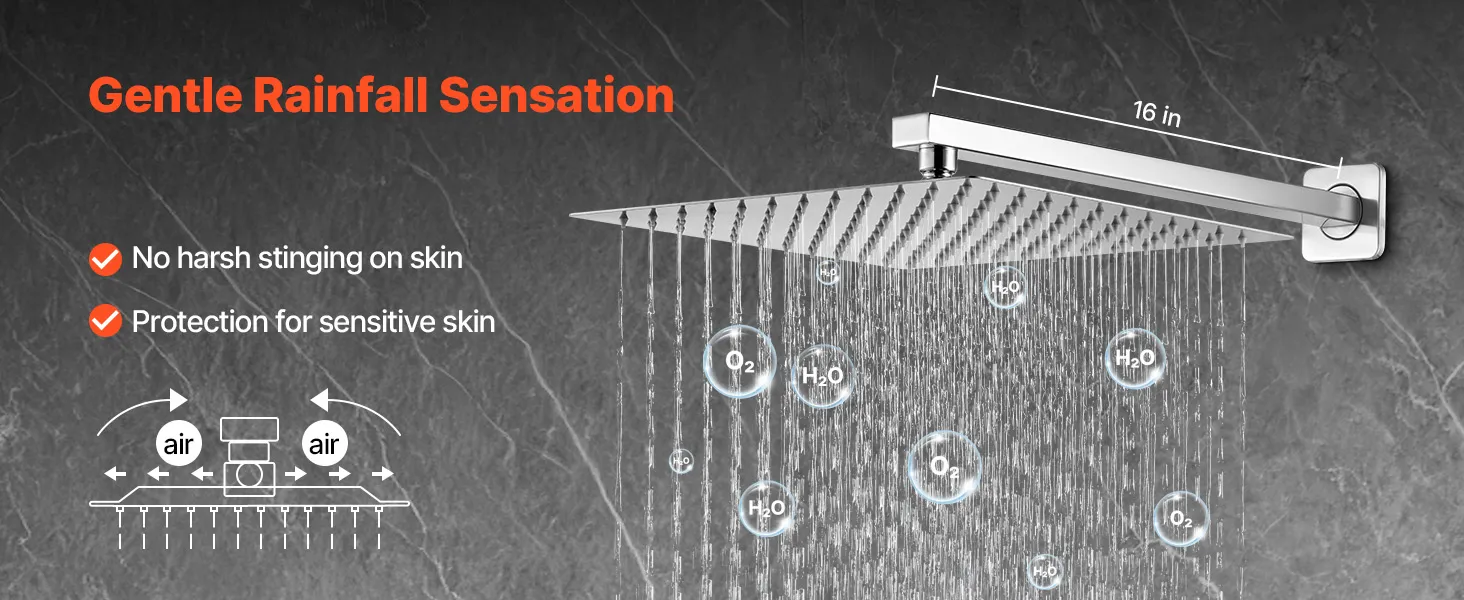 • Vienmērīgs ūdens pārklājums: 16 collu/40,6 cm pagarinātā dušas roka palielina pārklājumu, nodrošinot vienmērīgu lietusgāzi. 360° rotējošā dušas galva atbilst dažādiem leņķiem, un G 1/2 collu savienojumam nav nepieciešamas papildu detaļas, lai to būtu viegli uzstādīt.