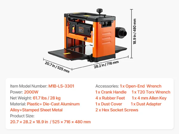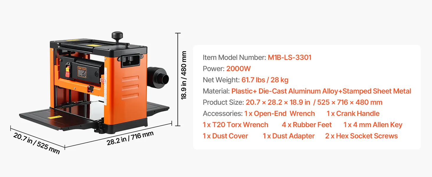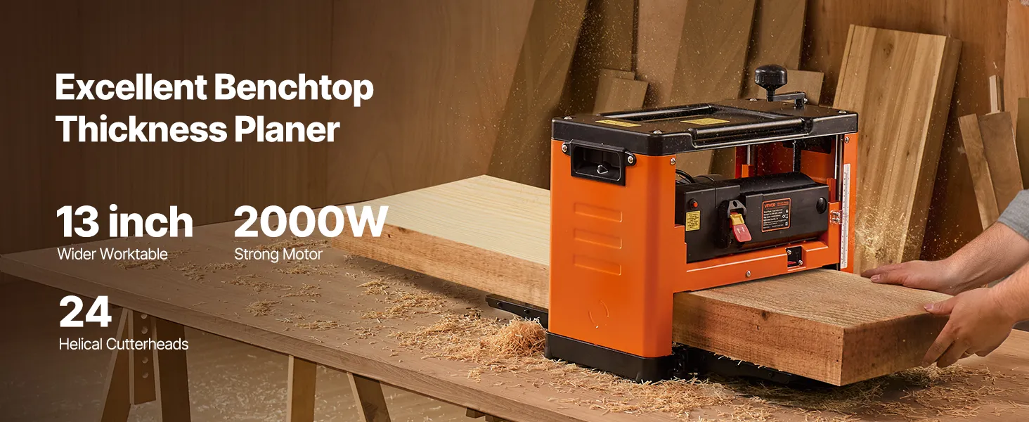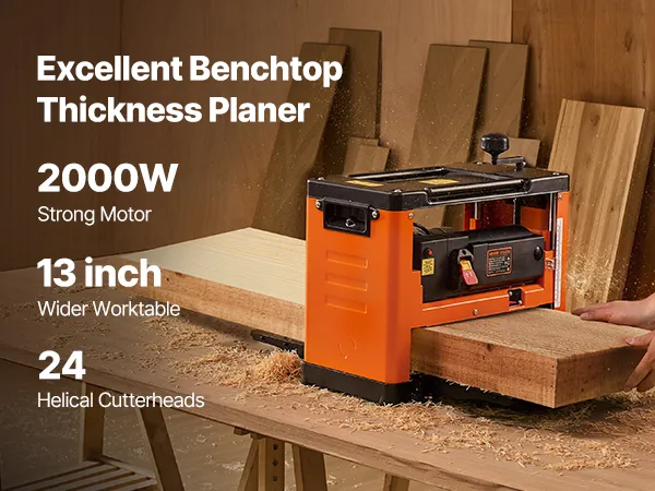 Designed for DIYers and small workshops. This woodworking planer features a dual-roller feed system, a powerful motor, 24 spiral alloy blades, 1/8-inch precise depth control, and millimeter-scale accuracy. It easily handles thick hardwoods. Built-in dust ports keep your space clean.