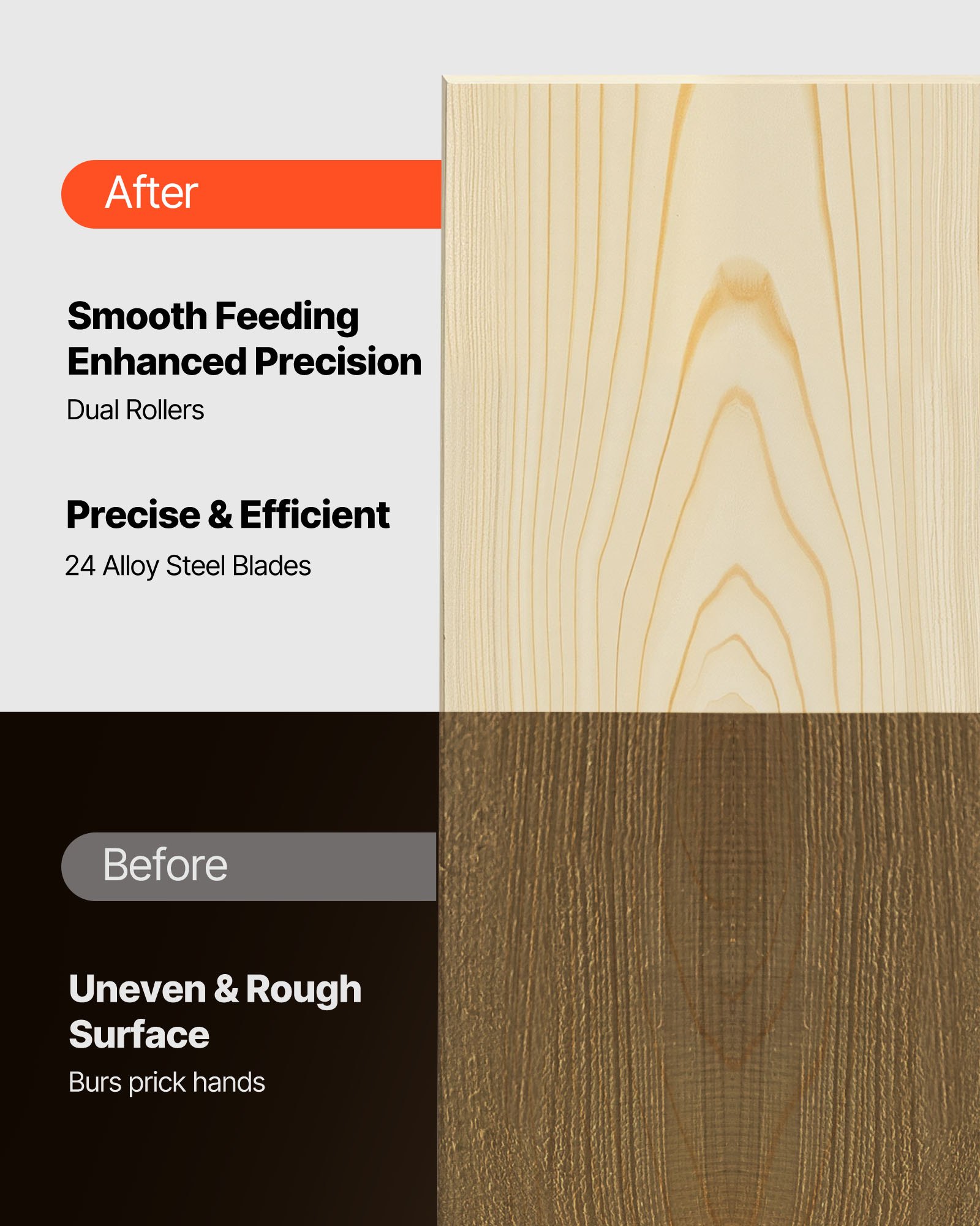 A: The planer features dual rollers at infeed/outfeed ports for stable feeding. It ensures the worktable is level during use, or add sacrificial scrap boards before/after your project boards.