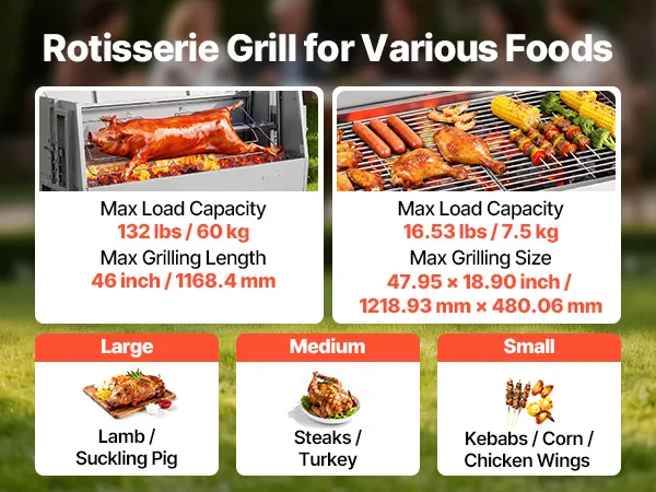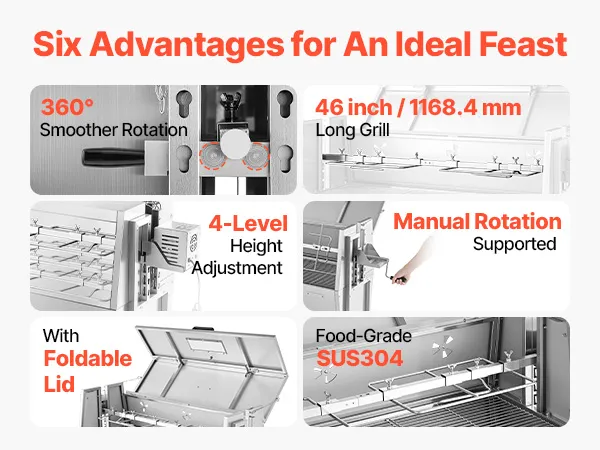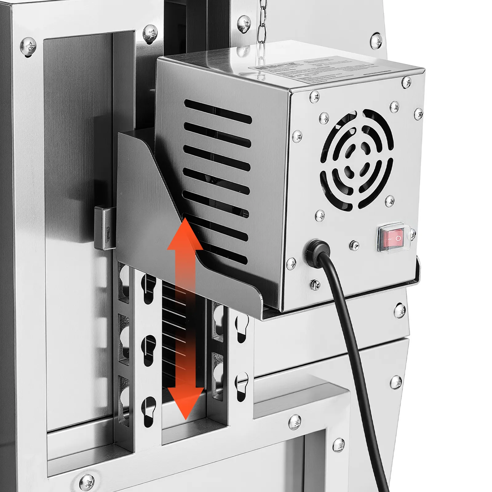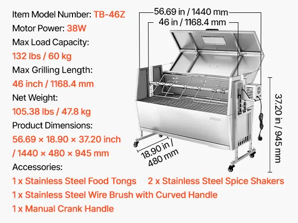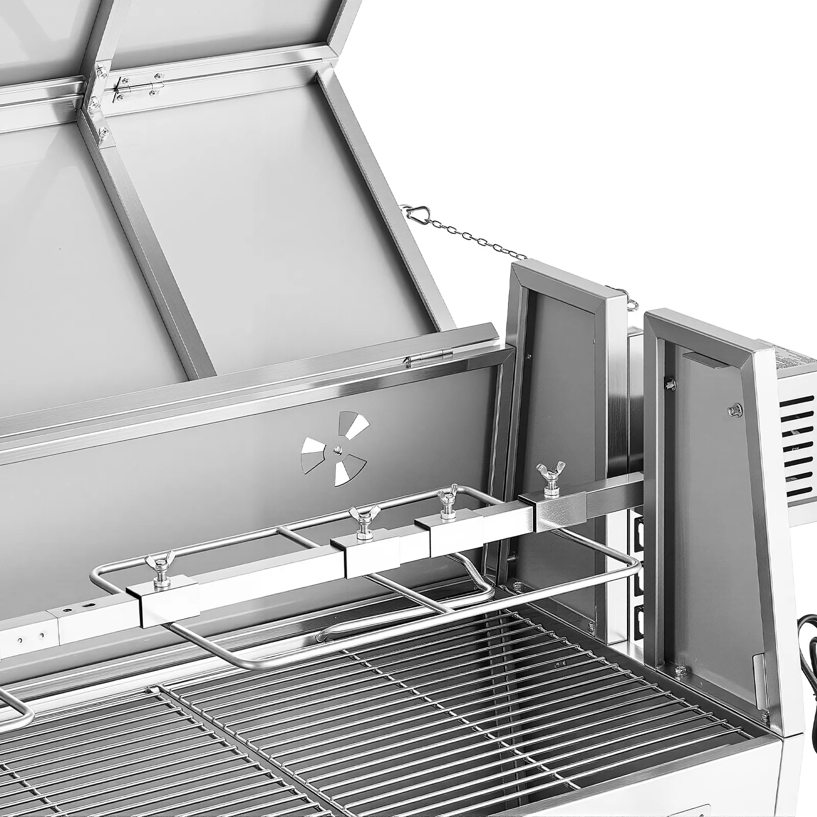 This 46 inch/1168.4 mm rotisserie grill, equipped with a 38W motor and a cooling fan, it rotates smoothly 360° while handling up to 132 lbs/60kg of pork or lamb. Four adjustable heights offer precise heat control, SUS304 forks, and stainless steel construction ensure durability and easy cleaning.