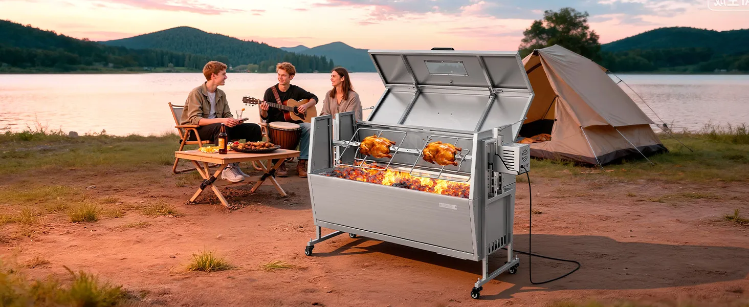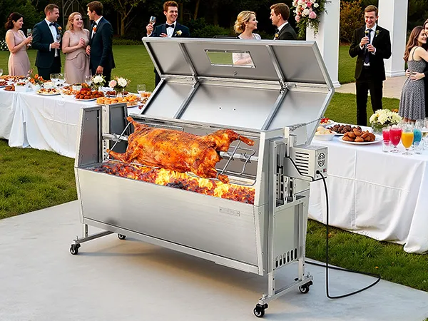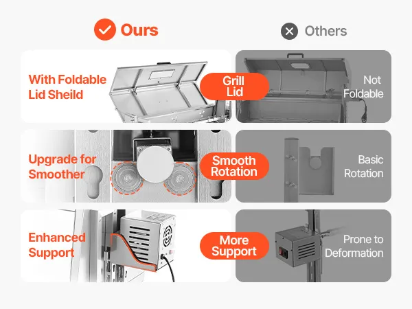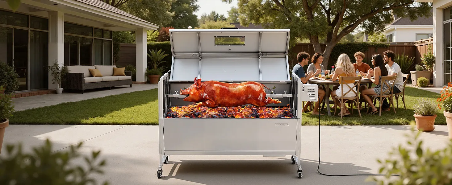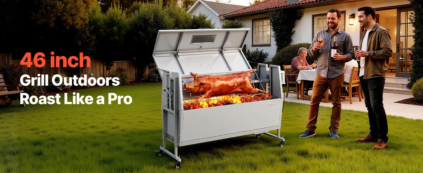 This 46 inch/1168.4 mm rotisserie grill, equipped with a 38W motor and a cooling fan, it rotates smoothly 360° while handling up to 132 lbs/60kg of pork or lamb. Four adjustable heights offer precise heat control, SUS304 forks, and stainless steel construction ensure durability and easy cleaning.