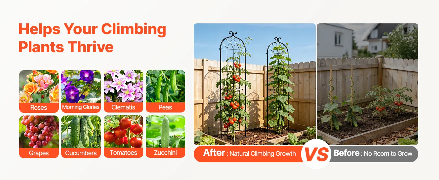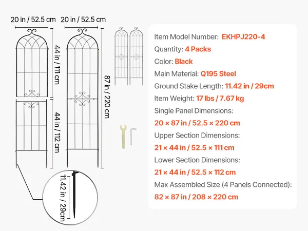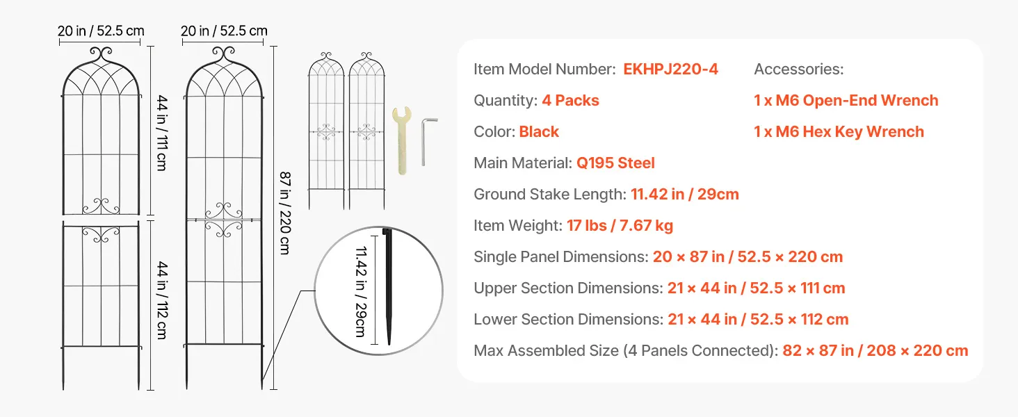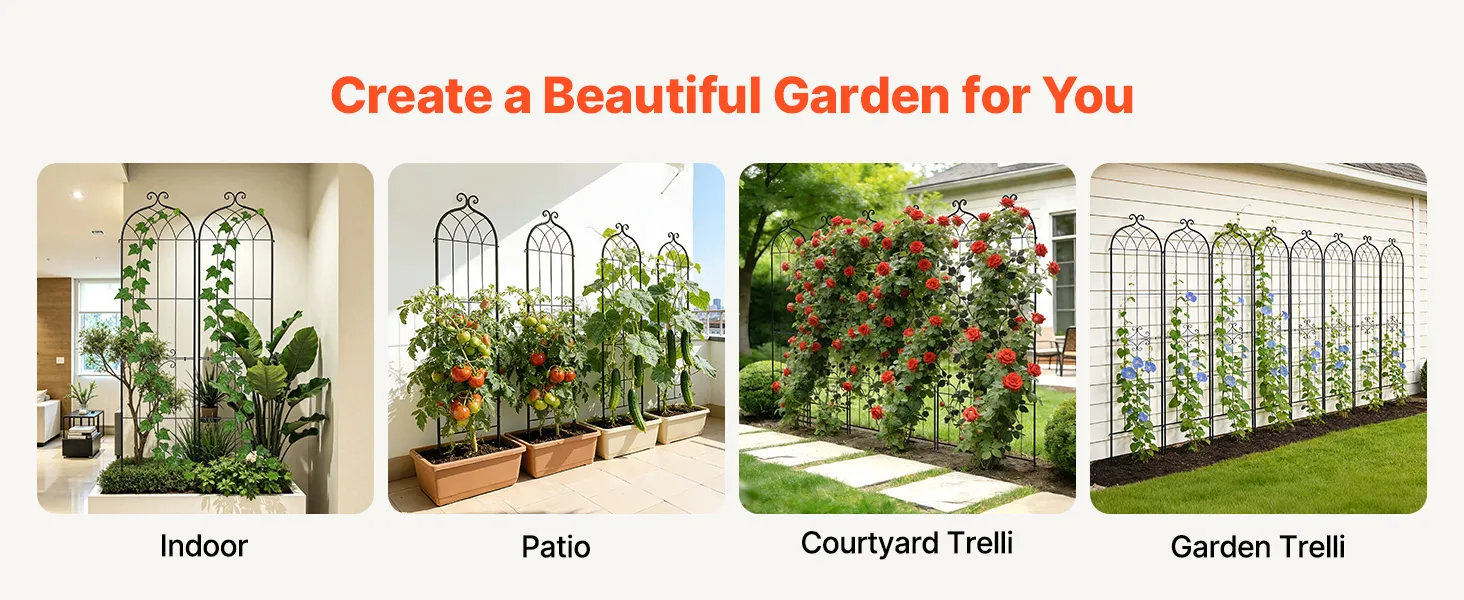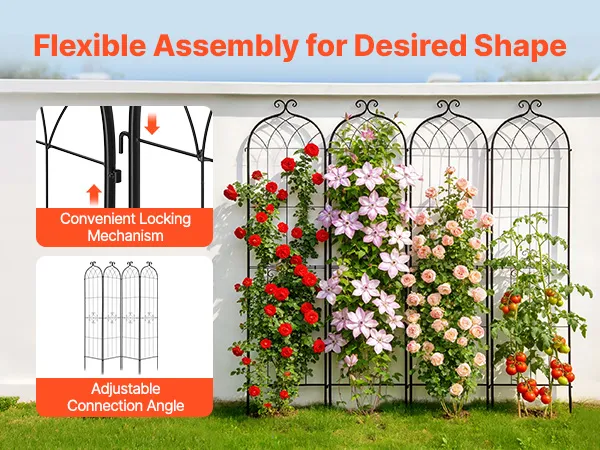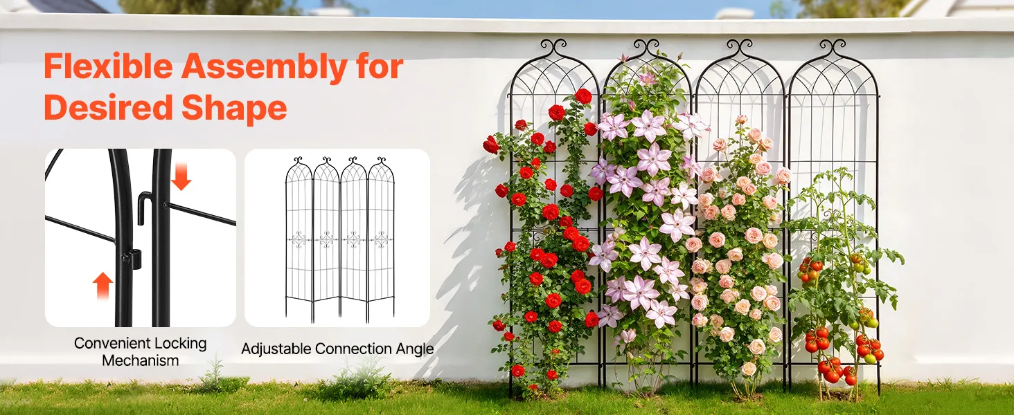 Each climbing clematis trellis panel comes in two sections that assemble quickly using the included wrench and screws. Built-in locking connectors allow you to link multiple panels and adjust angles flexibly, making it easy to create the ideal shape for your garden layout.