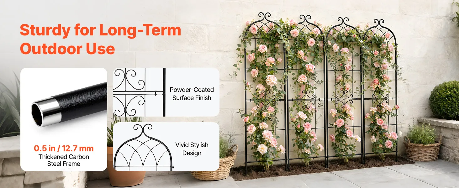 Built with upgraded 0.5 in (1.3 cm) carbon steel and a weather-resistant powder coating, this garden trellis resists rust and outdoor wear. The 11.42 in (29 cm) ground stakes anchor firmly in soil, grass, or damp ground for stable, tip-resistant support.