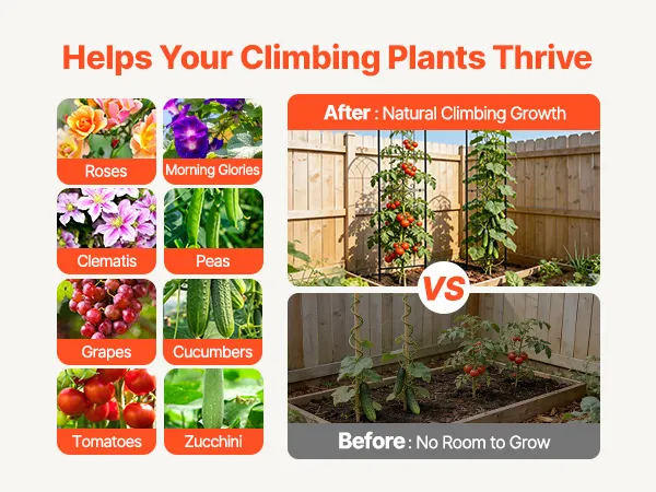 Designed to support various climbing plants and vining vegetables, this garden flower rose trellis provides space for plants to grow strong and upright. Ideal for climbing roses, ivy, clematis, jasmine, morning glories, cucumbers, tomatoes, peas, and more.