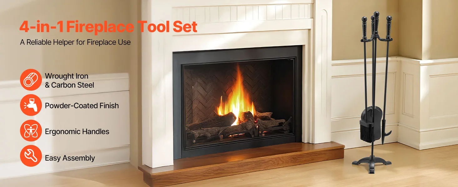 • 4-in-1 Fireplace Tool Set: This fireplace tool set includes a poker, ash shovel, brush, and tool stand. It easily handles fire adjustment and ash cleaning. All parts work together, making fireplace use more efficient and convenient